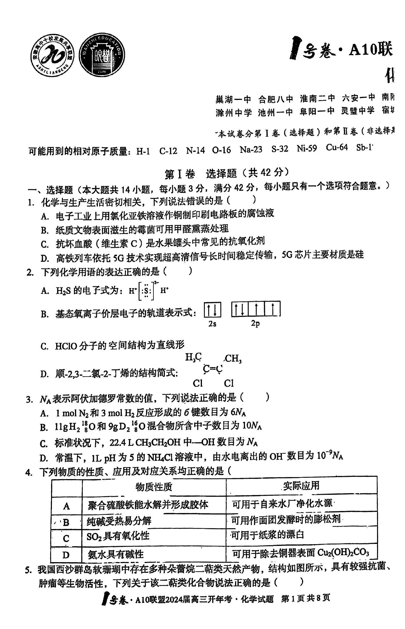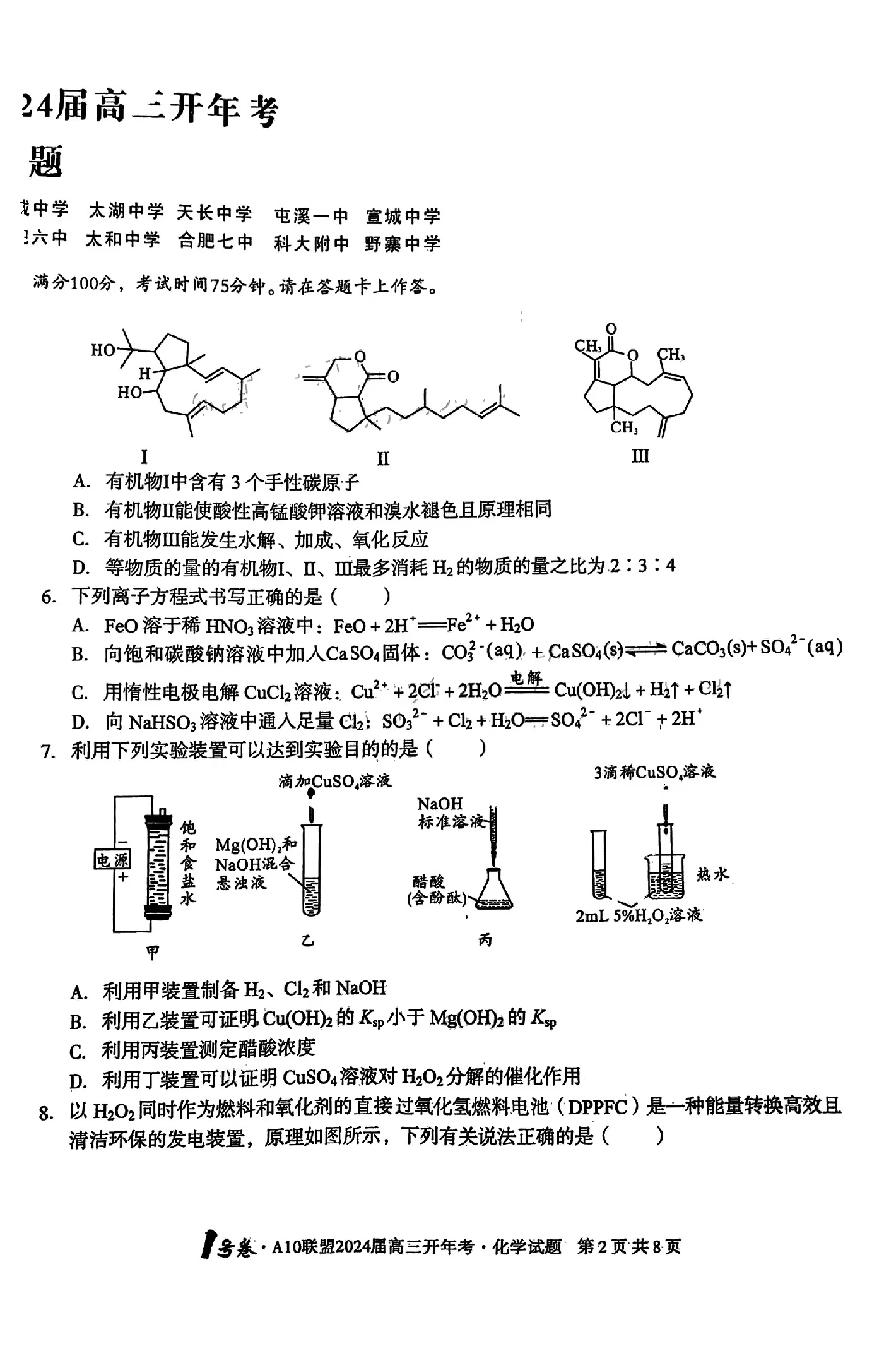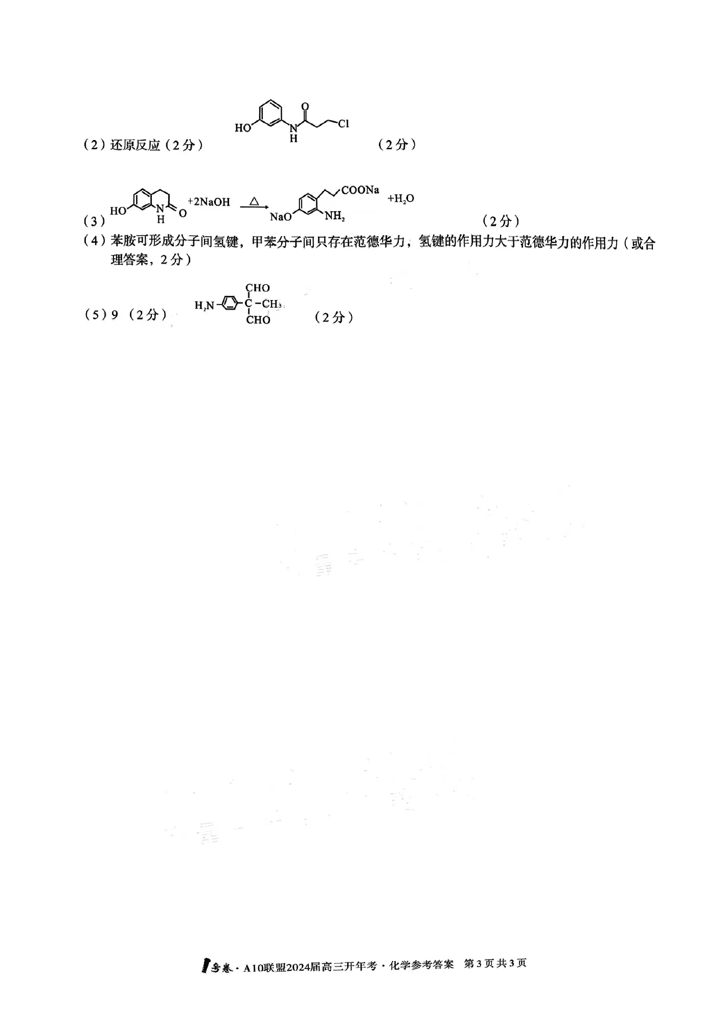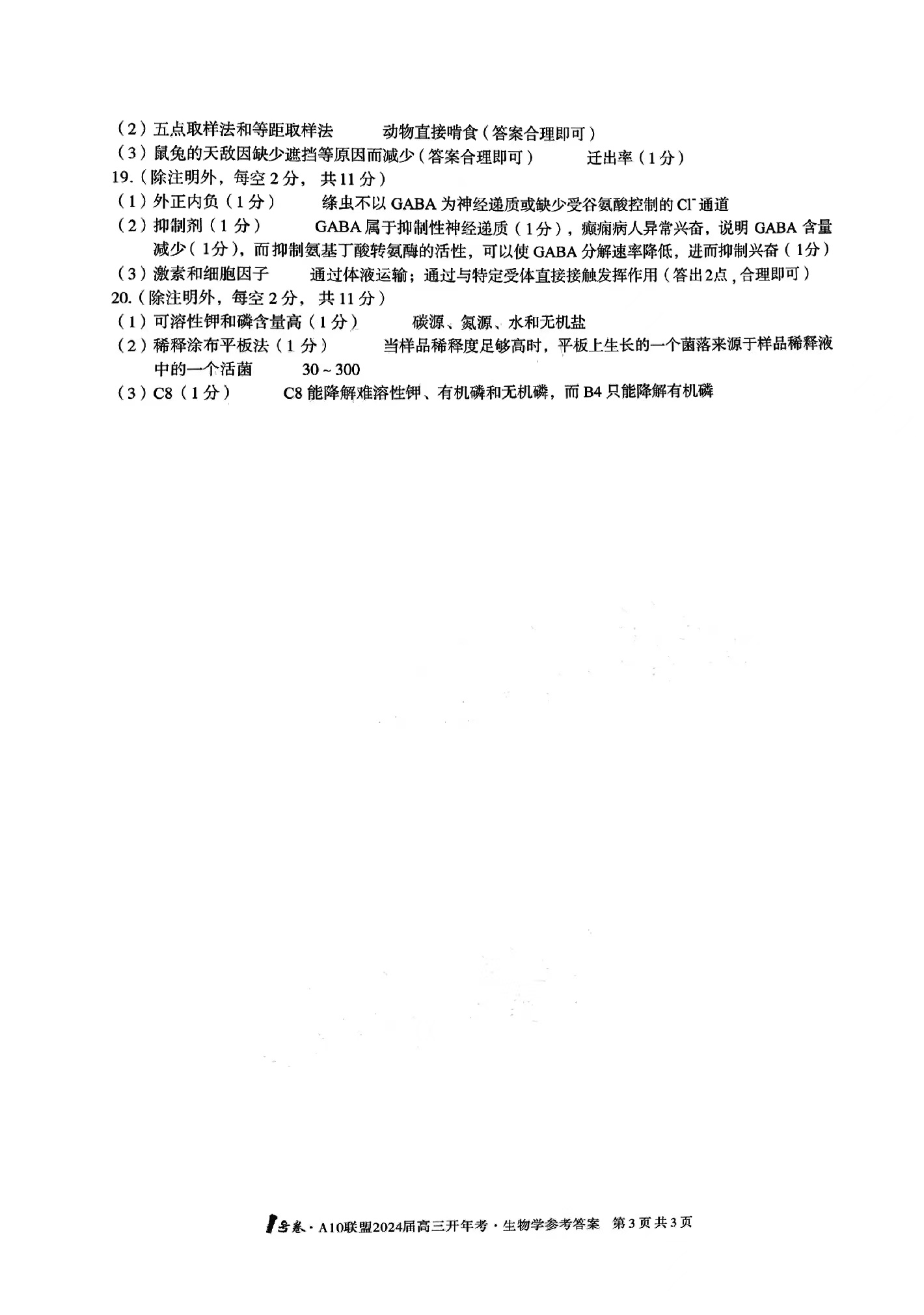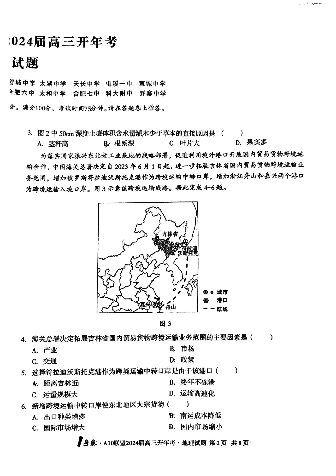 以下为2024届安徽A10联盟高三开年考各科答案及试卷汇总: