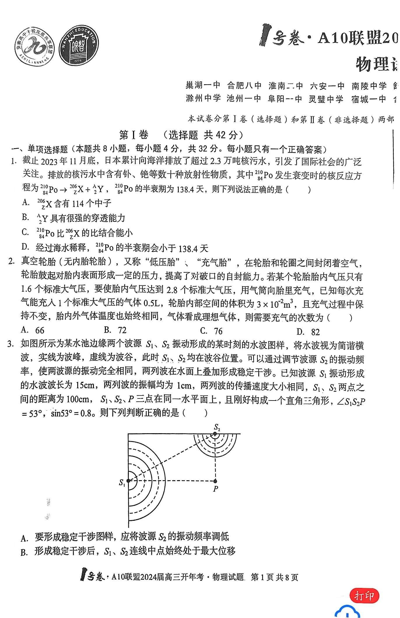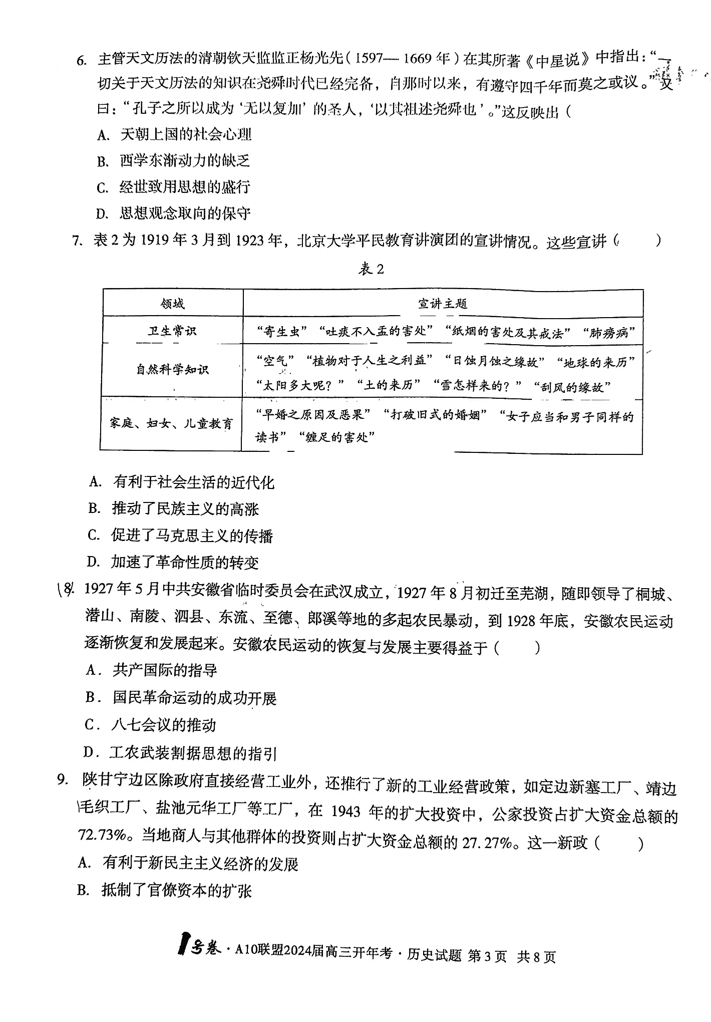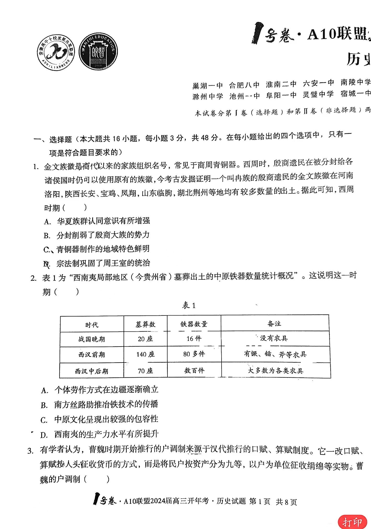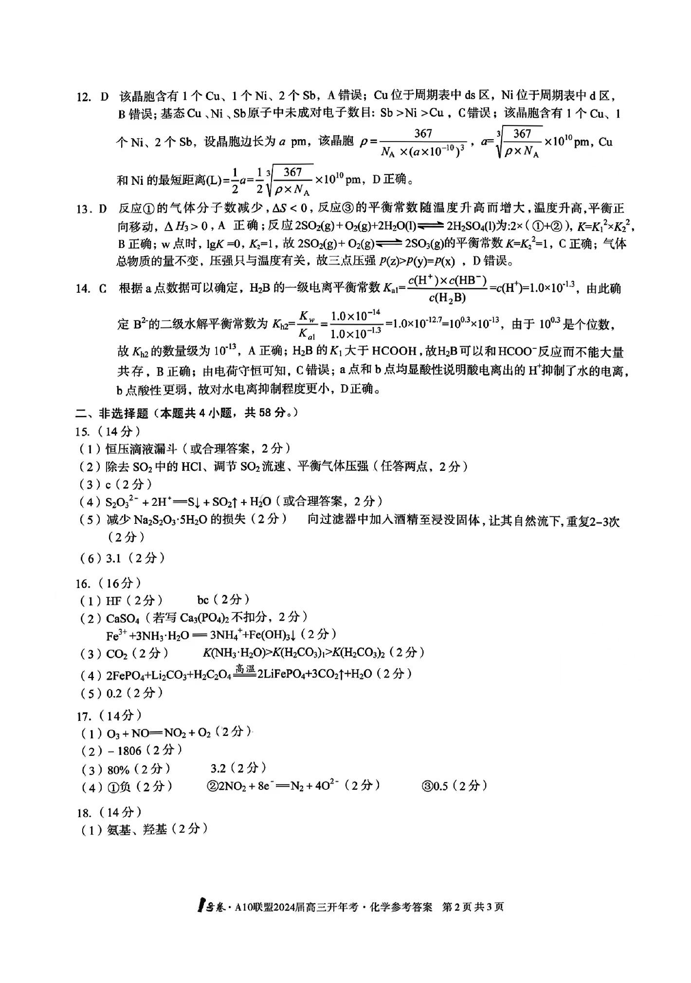 以下为2024届安徽A10联盟高三开年考各科答案及试卷汇总: