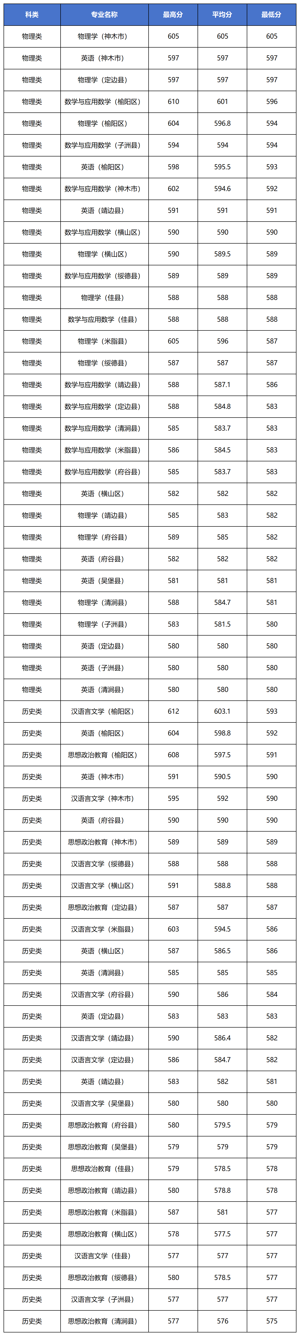8、榆林学院2025年最低分:物理类是580分、历史类是575分