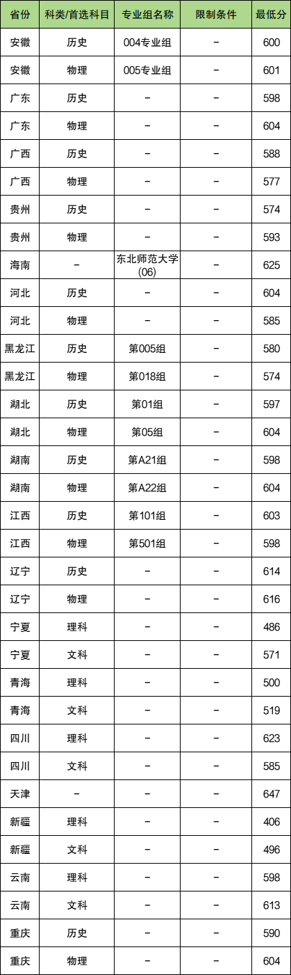 除上述省份外,其余省份上东北师范大学的最低分如下,供参考: