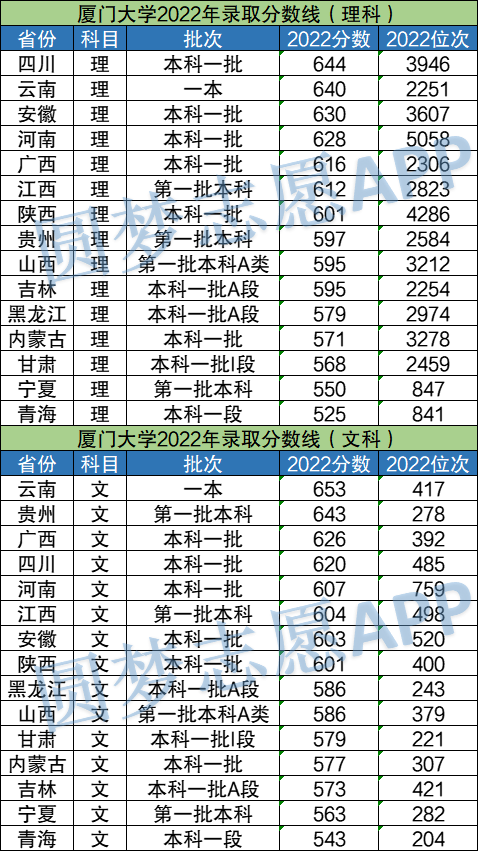 可以看到,2022年厦门大学在旧高考文理省份的理科招生中,录取分数线最高的省份是四川省644分,最低的是青海省525分。