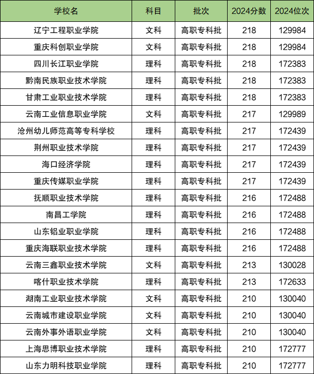 文科分数线刚好为210分的大学:湖南工业职业技术学院、云南城市建设职业学院、云南外事外语职业学院;