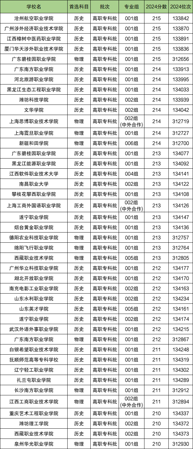 历史组分数线在210分左右的大学及专业组:沧州航空职业学院001组(215分)、广东南方职业学院001组(214分)、广东碧桂园职业学院001组(213分)等;
