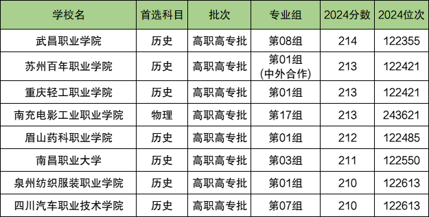 湖北高考210分左右能上的大学有武昌职业学院、苏州百年职业学院、重庆轻工职业学院、南充电影工业职业学院、眉山药科职业学院等,具体名单及其对应的专业组如下表所示: