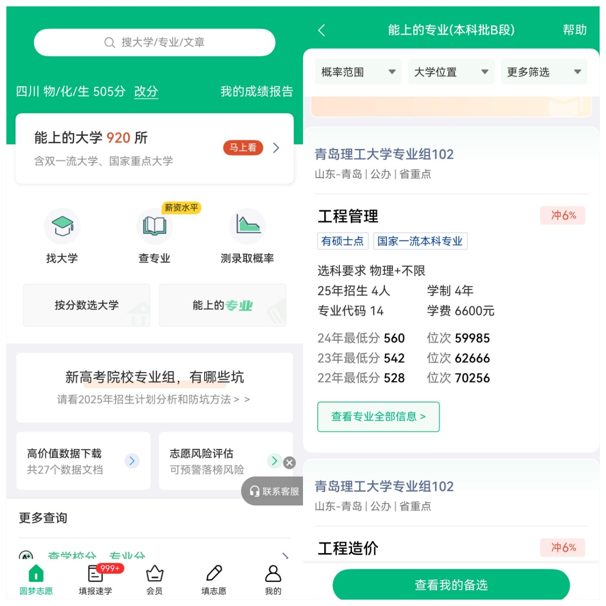 圆梦志愿支持输入分数查能上的专业,考生可根据自己的兴趣爱好查看喜欢的专业中能上的大学有哪些。