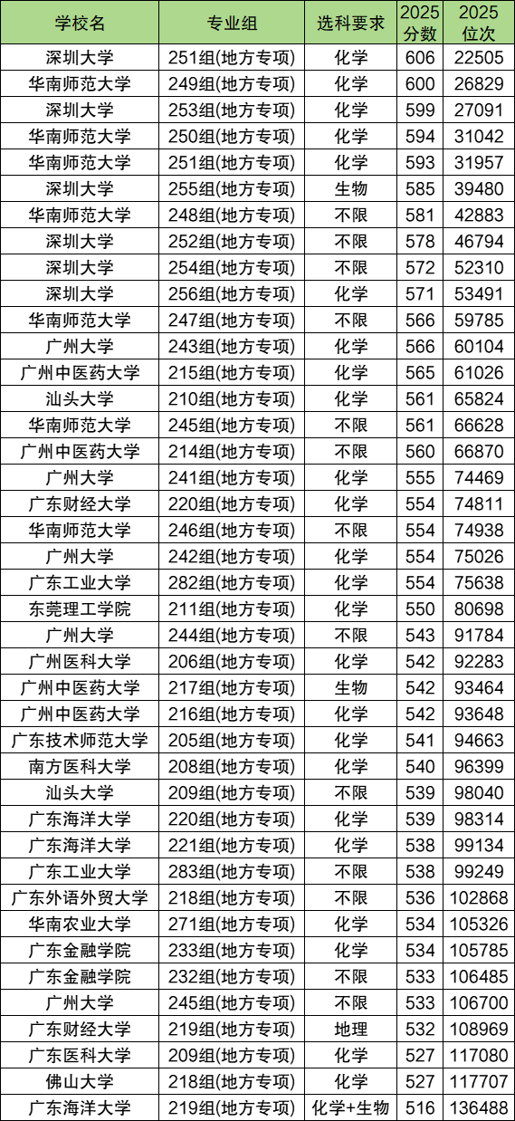 2025年广东地方专项计划历史组录取分数线位于516分到606分之间,收分最低的为广东海洋大学(219专业组),对应专业是食品科学与工程、食品质量与安全,最低位次是136488名;收分最高的是深圳大学(251专业组),包含专业有电子信息类、自动化类、计算机类、数学与应用数学、光电信息科学与工程、智能建造、工程管理、智慧交通,最低位次是22505名。