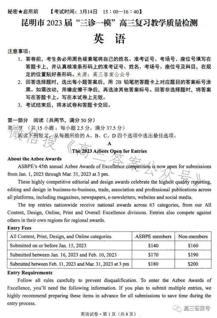 2023昆明三诊一模高三3月统考将于3月13日进行考试,所有科目试卷及答案届时同步更新,本文圆梦志愿小编整理了2023昆明高三3月统测各科试题及参考答案,包括语文试卷及答案、数学试卷及答案、英语试卷及答案、文综试卷及答案、理综试卷及答案等,供大家参考,请大家持续关注本文或高考100网站。