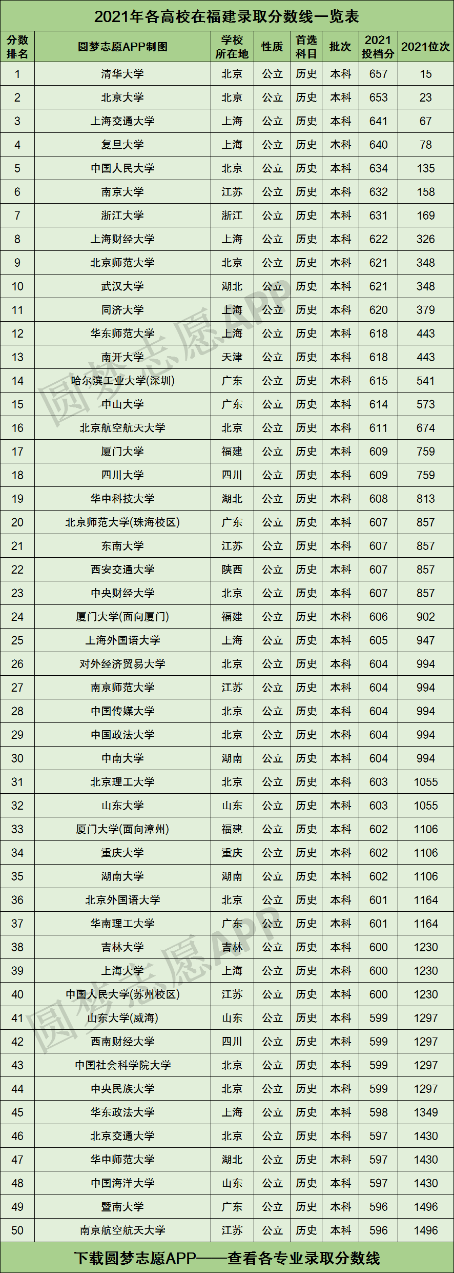 根据上图可知,2021年福建高三首选历史考生,只有成绩考到了596分以上、在全省首选历史考生中排名前1496名,才有机会被全国50强大学录取!