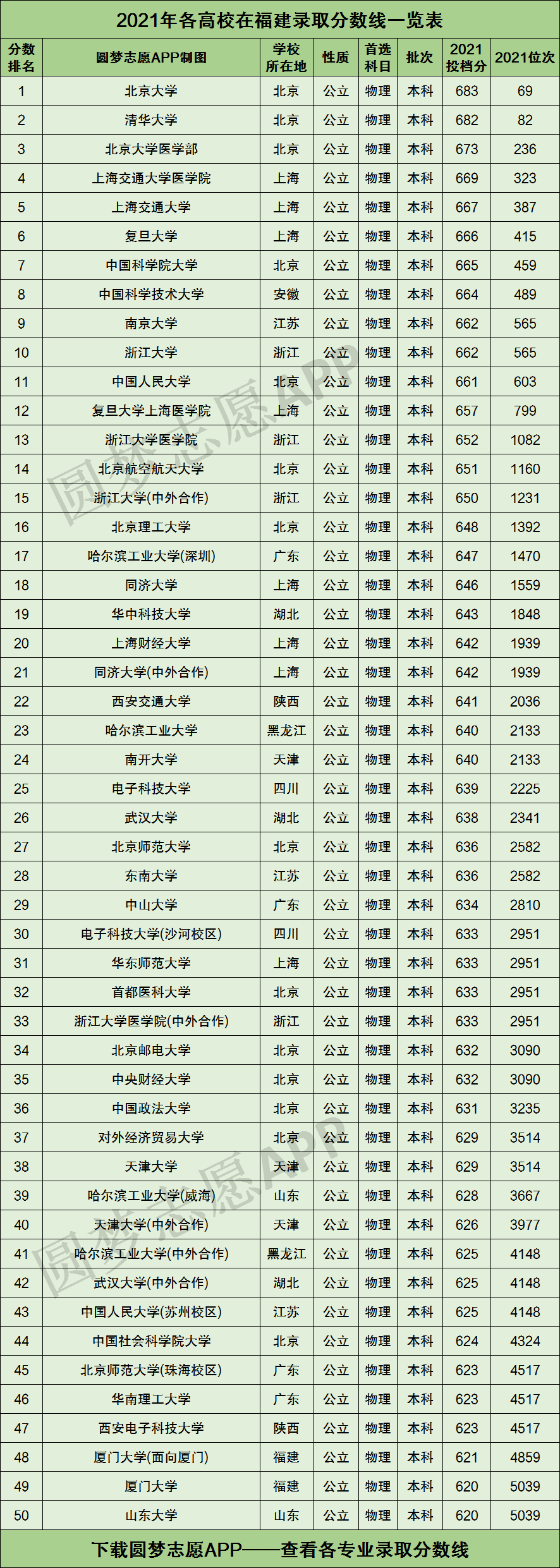 对于不想留在福建省读大学的高三同学来说,全国各地的高校在福建省的录取分数线则才是一份最有价值的参考资料。不过本文由于篇幅有限,将仅为大家展示2021年各高校在福建录取分数线最高的前50所大学,如果你想查看全国近3000所大学在福建省的录取分数线排名,可以在圆梦志愿APP中直接下载EXCEL表格。