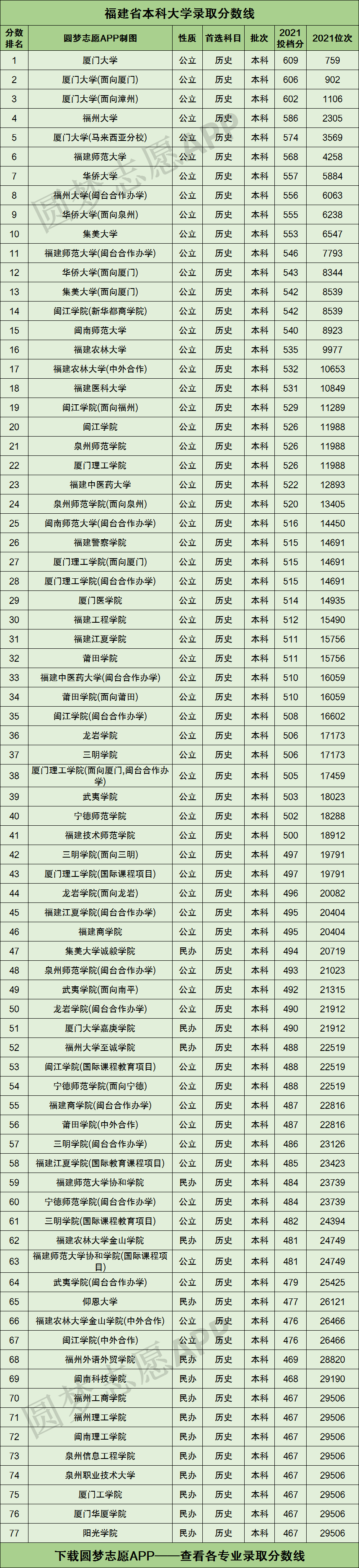 根据福建省考试院公布的数据,圆梦志愿按照首选历史投档分数线的高低排序,为大家整理出了下图这份福建省内的所有本科大学首选历史录取分数线排名榜单: