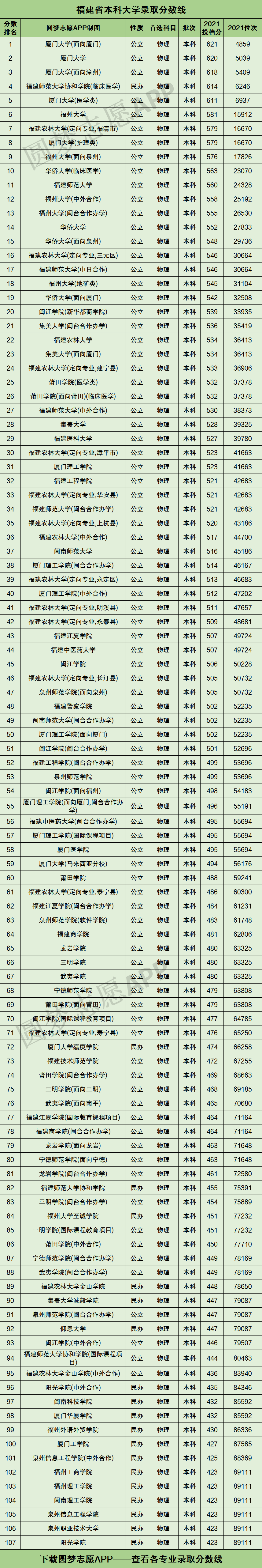 圆梦志愿根据考试院的数据,为大家整理了福建省内所有本科大学2021年高考首选物理的投档分数线及位次排名。具体见下图: