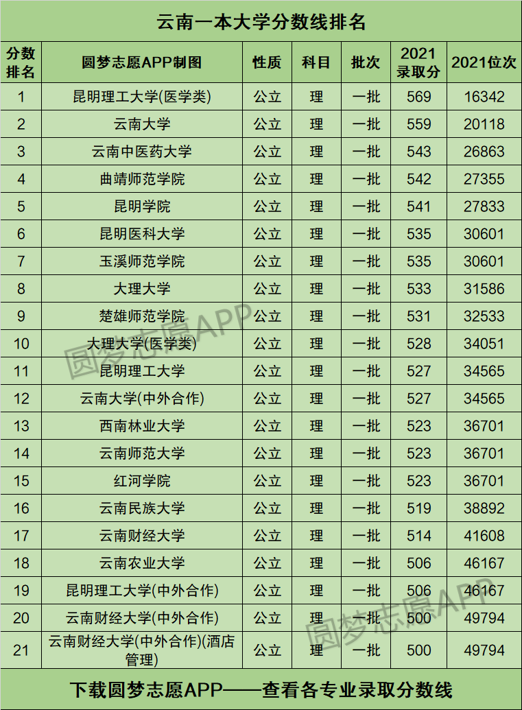 本文将为大家奉上云南省内所有的一本大学2021年的招生录取分数线排名汇总,供2022年云南省高考生查阅!