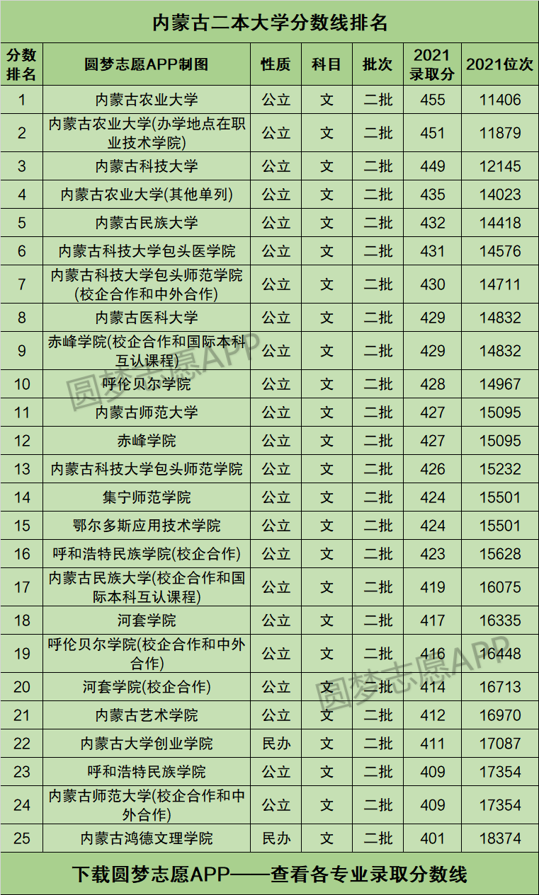 根据内蒙古教育考试院的数据,圆梦志愿为大家整理了内蒙古所有二本大学2021年在内蒙古文科的录取分数线排名汇总表。其中,内蒙古农业大学在文科的录取分数线最高,其2021年的录取分为455分、最低位次为11406名。