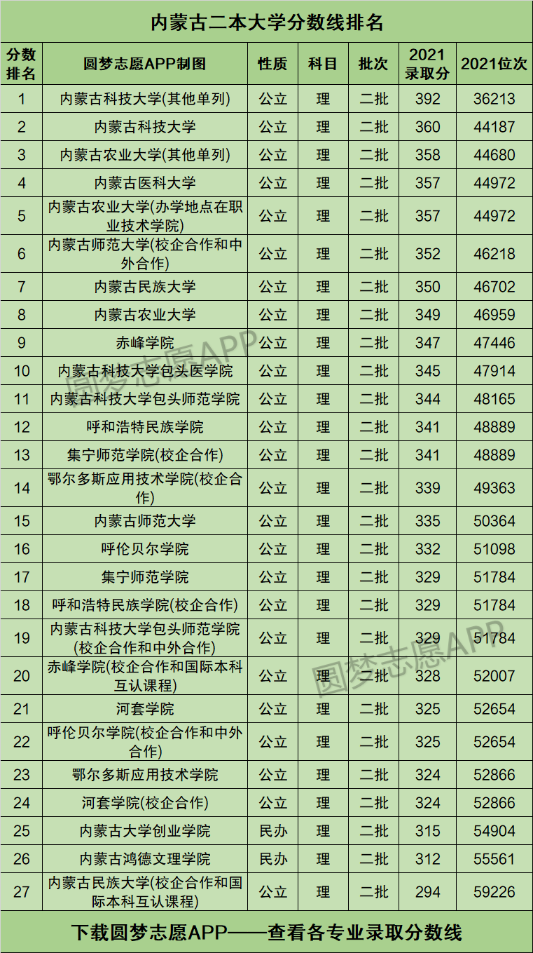 内蒙古二本大学有哪些学校?它们2021年在内蒙古高考文理科的最低录取分数线是多少?了解这两个问题的答案后,内蒙古高三考生在择校时将会更加游刃有余。