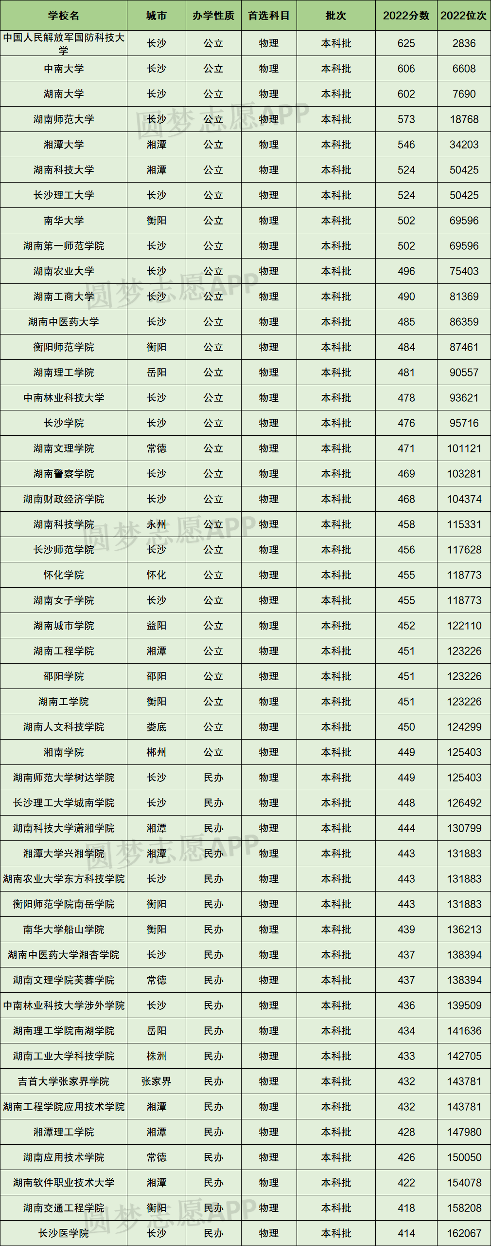 一、湖南省的大学排名及录取分数线2022年(首选物理科目)