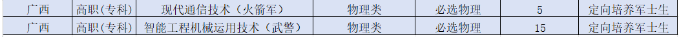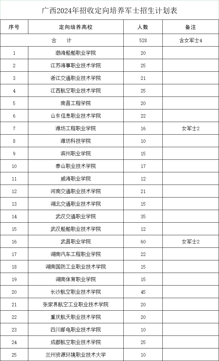 在广西专科提前批招收定向培养军士的学校有25所,招收528人(含女军士4人)。