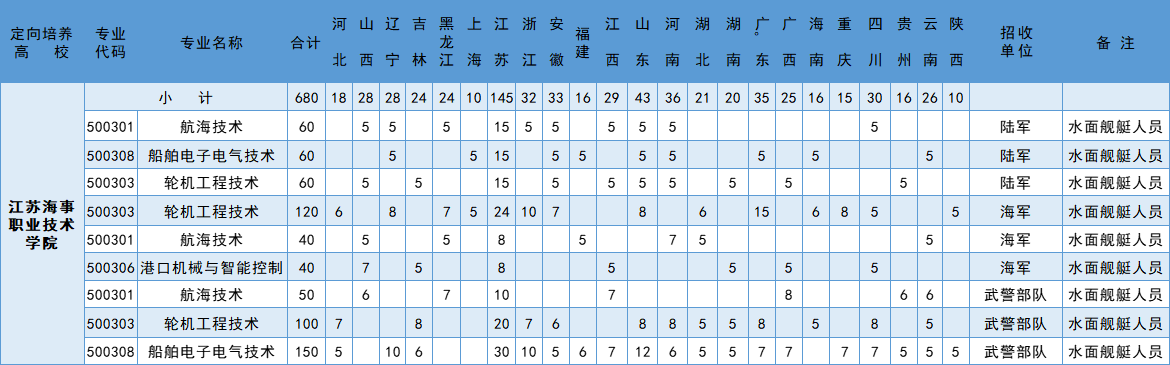 1、江苏海事职业技术学院招生专业有轮机工程技术,招生5人,招收单位是陆军;港口机械与智能控制招生5人,招收单位是海军;航海技术招生8人,招收单位是武警部队;船舶电子电气技术招生7人,招收单位是武警部队。