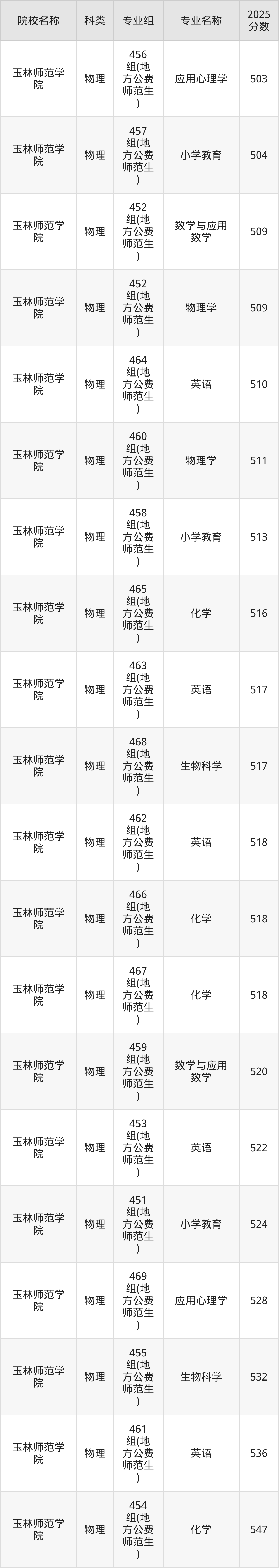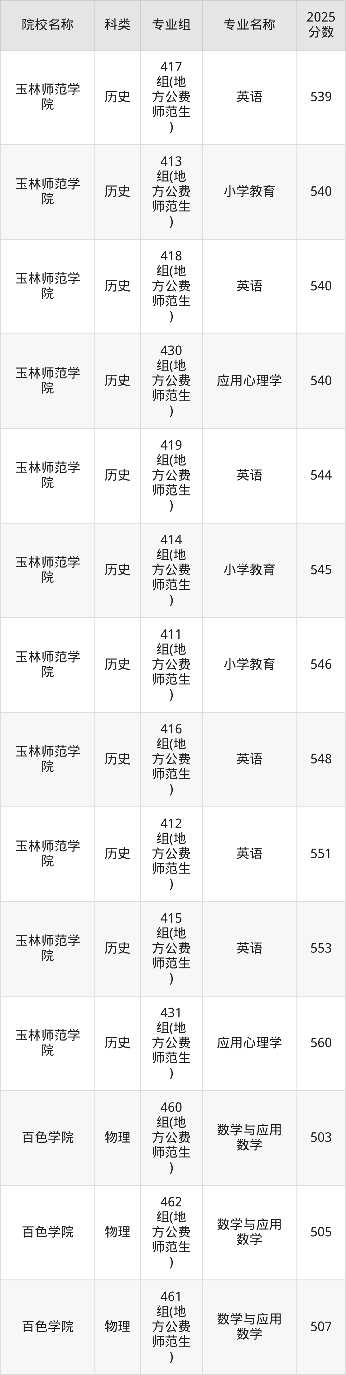 2025年广西地方公费师范生各校录取分数线如下:玉林师范学院最低503分、百色学院最低503分。