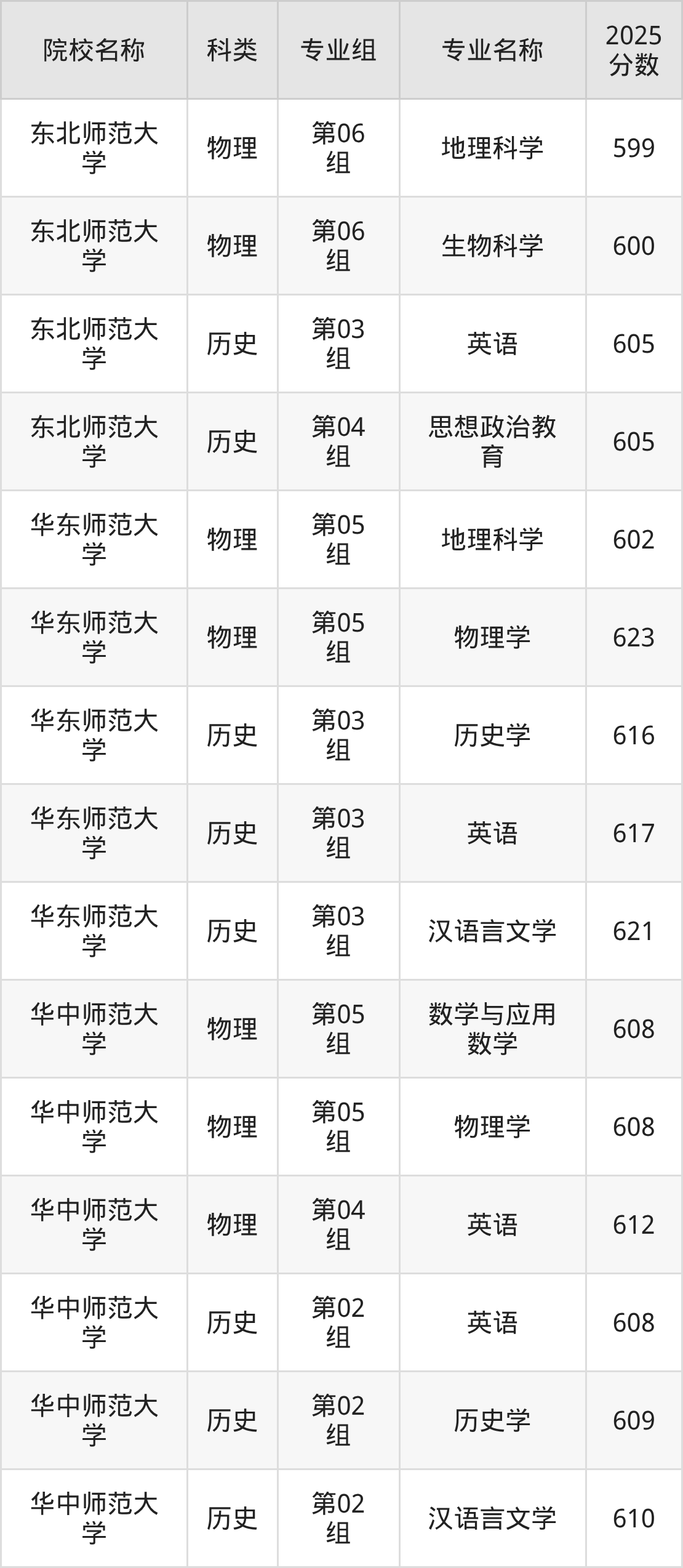 2025年湖北优师专项计划各校录取分数线如下:东北师范大学最低599分、华东师范大学最低602分、华中师范大学最低608分。