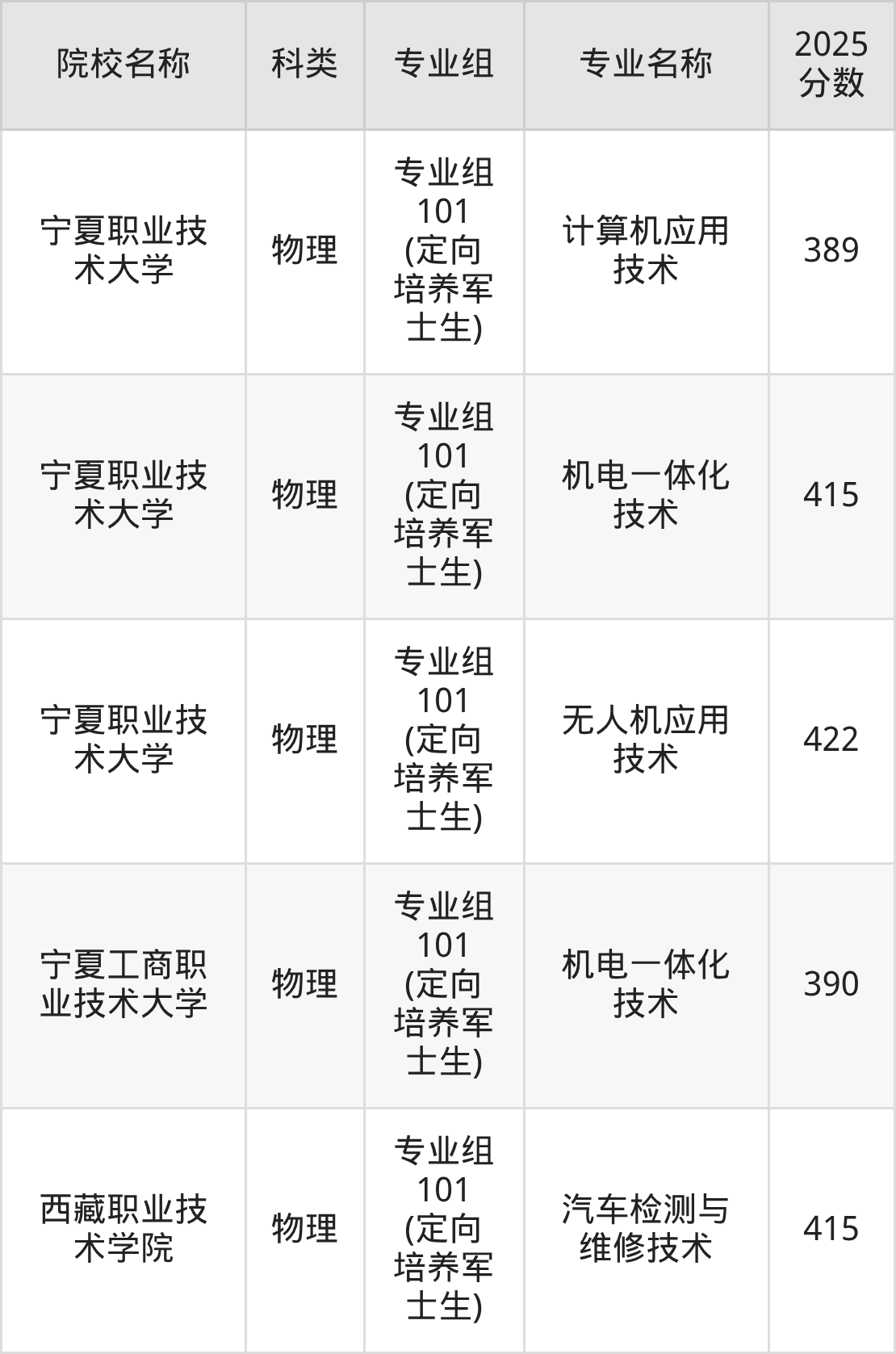 2025年在四川定向士官录取分数线主要位于385分-422分之间,物理类最低分385分,对应最低分专业是专业组101(定向培养军士生)的计算机网络技术专业。最高分定向士官专业是无人机应用技术,2025年录取分数线为422分。