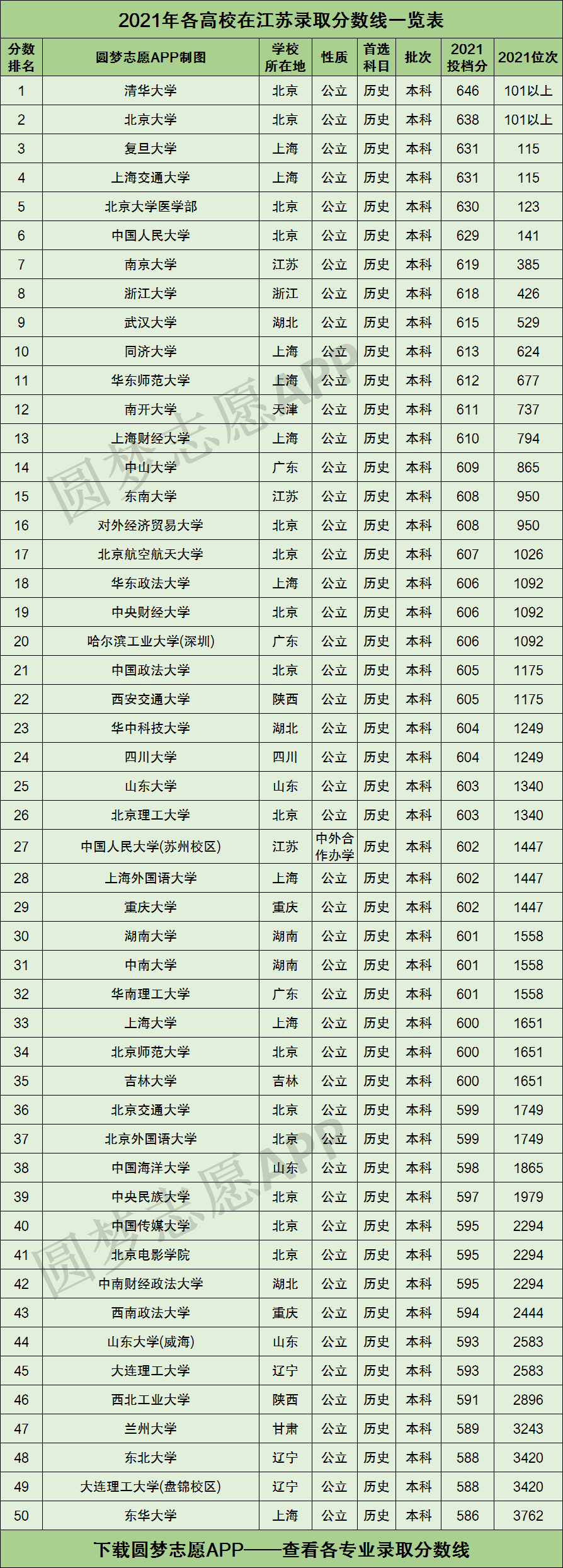根据上图可知,2021年江苏高三首选历史考生,只有成绩考到了586分以上、在全省首选历史考生中排名前3762名,才有机会被全国50强大学录取!