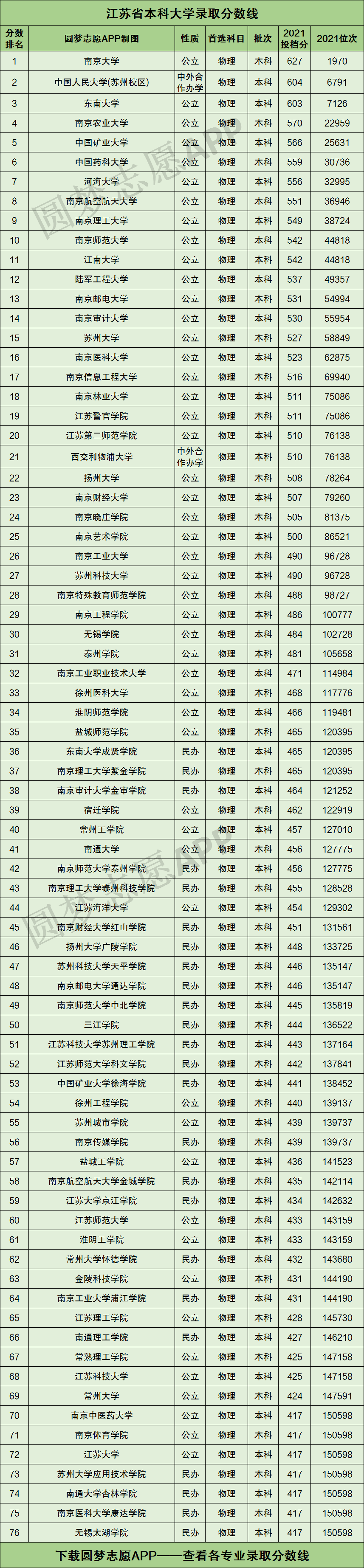 圆梦志愿根据考试院的数据,为大家整理了江苏省内所有本科大学2021年高考首选物理的投档分数线及位次排名。具体见下图: