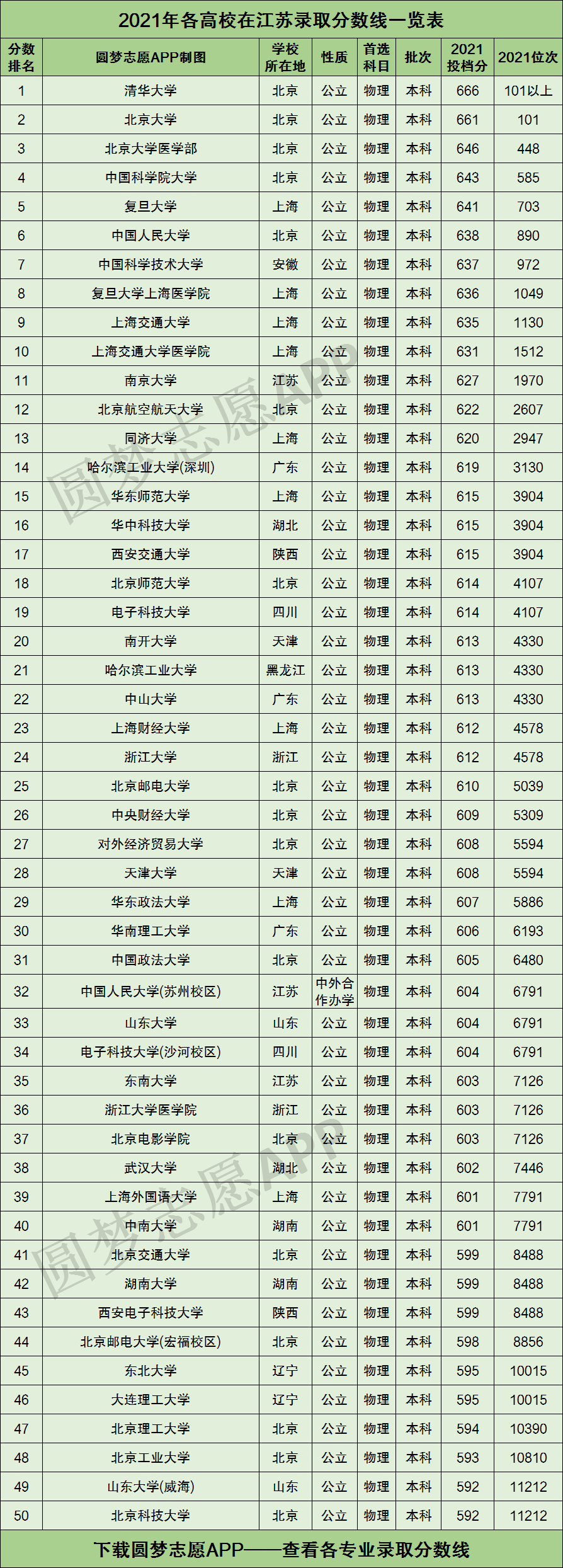 对于不想留在江苏省读大学的高三同学来说,全国各地的高校在江苏省的录取分数线则才是一份最有价值的参考资料。不过本文由于篇幅有限,将仅为大家展示2021年各高校在江苏录取分数线最高的前50所大学,如果你想查看全国近3000所大学在江苏省的录取分数线排名,可以在圆梦志愿APP中直接下载EXCEL表格。