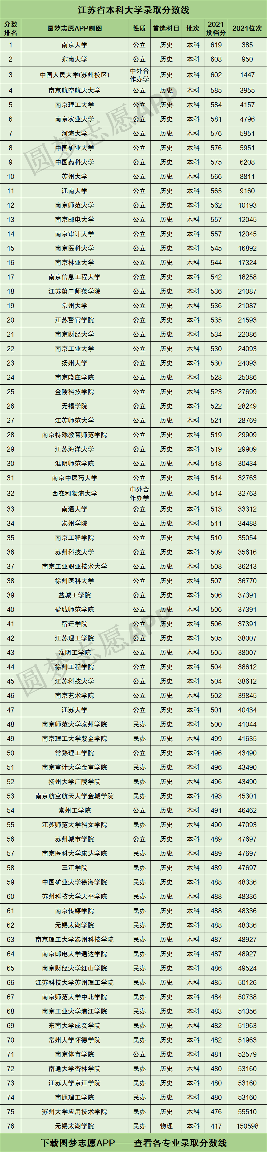 根据江苏省考试院公布的数据,圆梦志愿按照首选历史投档分数线的高低排序,为大家整理出了下图这份江苏省内的所有本科大学首选历史录取分数线排名榜单: