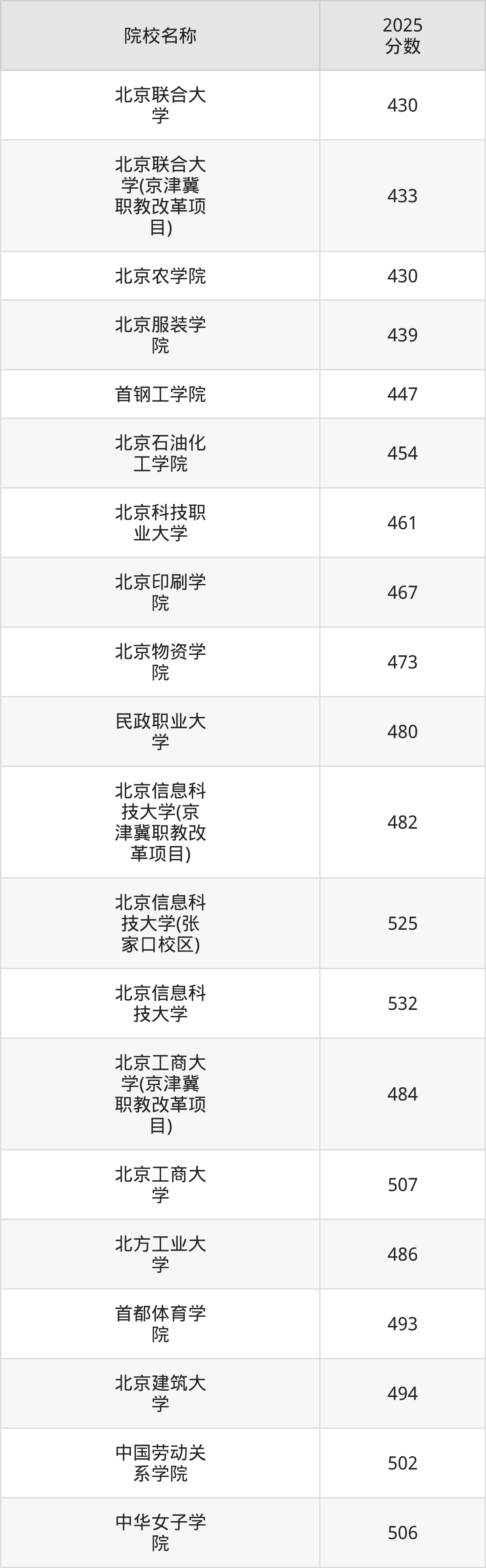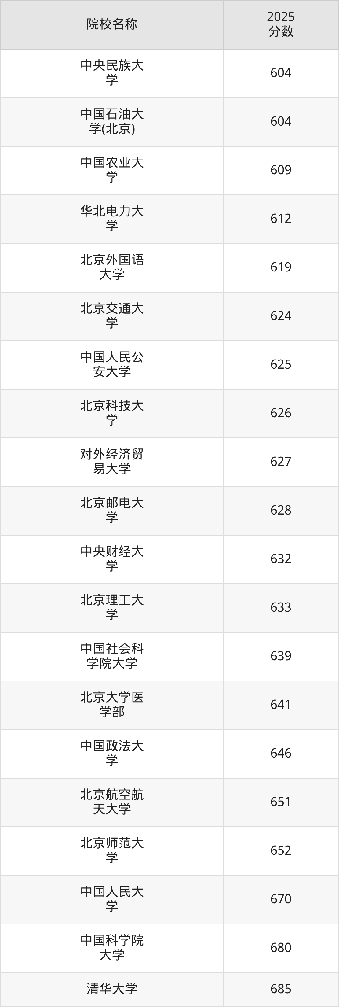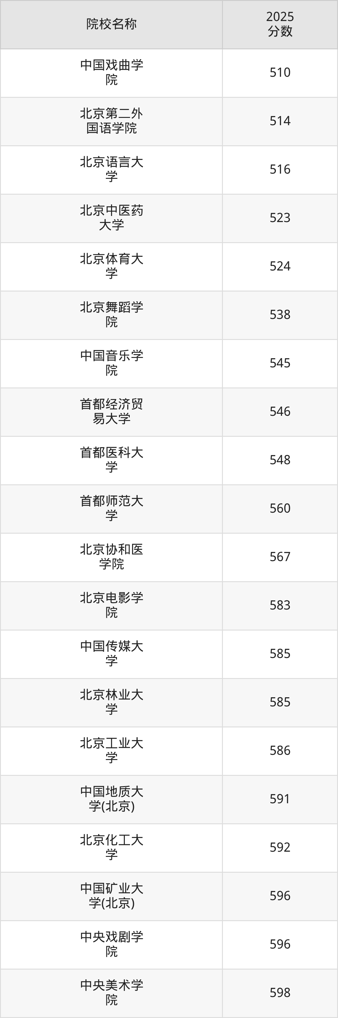 更多院校分数可在2025年北京公办本科录取分数线一览表中查询(数据较多,这里仅列举各校最低分):