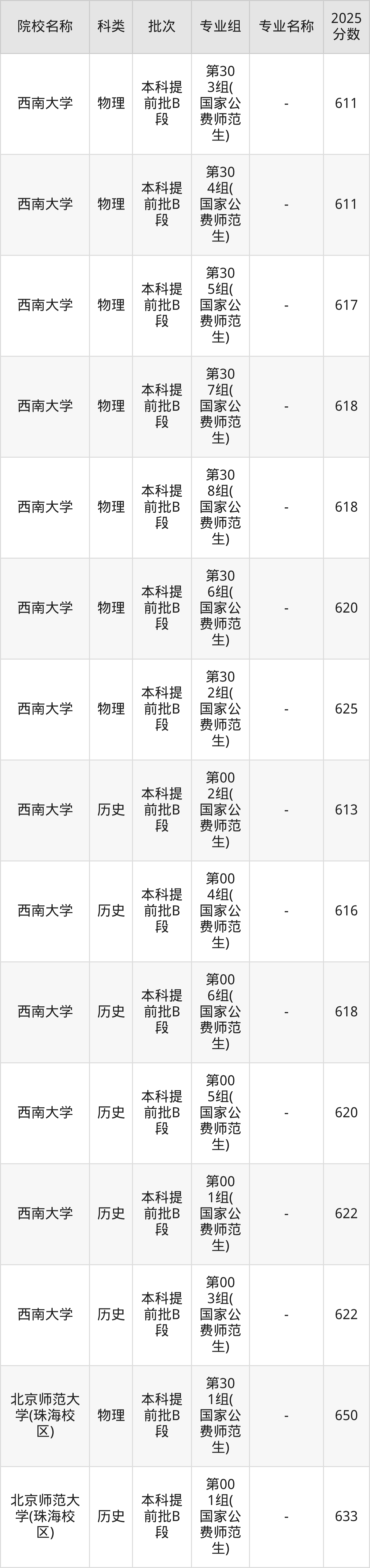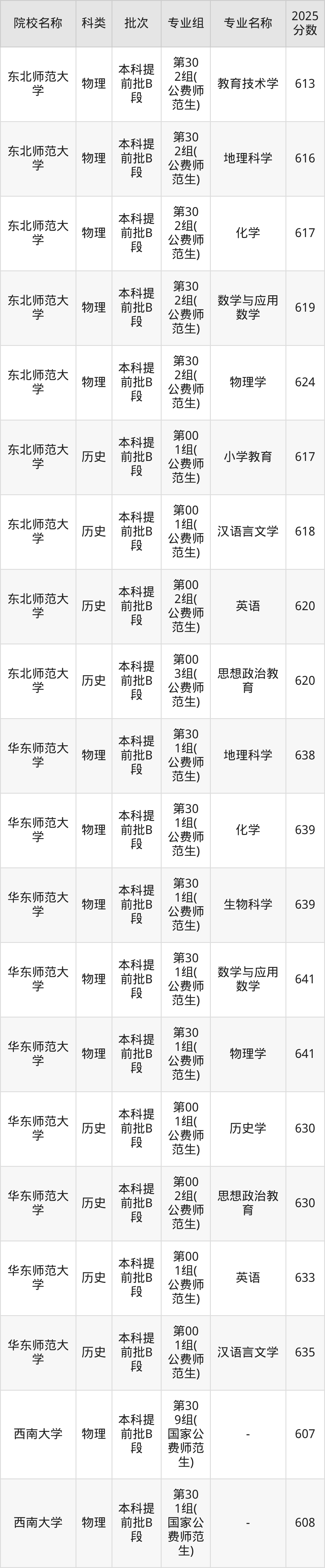 2025年在山西国家公费师范生录取分数线主要位于602分-636分之间,物理类最低分602分,对应最低分专业是第301组(公费师范生)的学前教育专业;历史类最低分603分,对应最低分专业是第001组(公费师范生)的特殊教育专业。