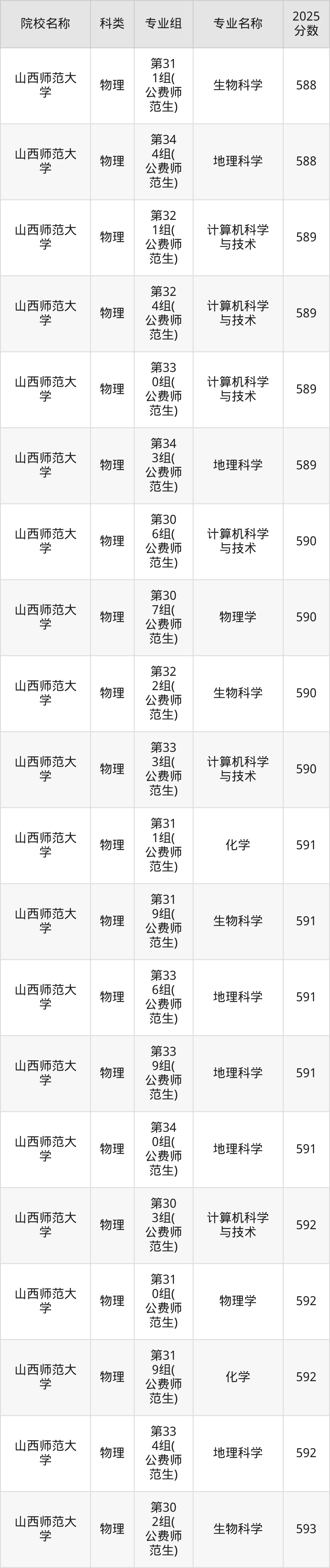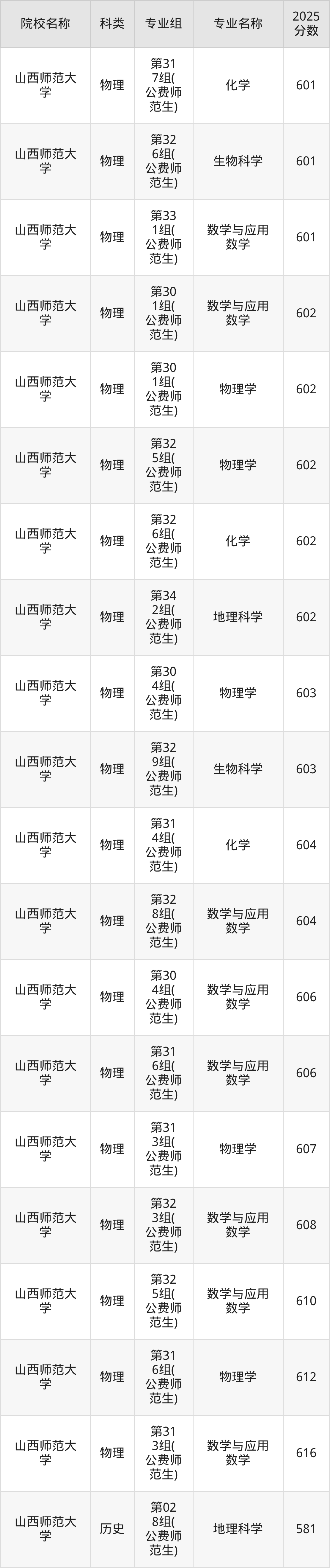 2025年在山西地方公费师范生录取分数线主要位于574分-616分之间,物理类最低分574分,对应最低分专业是第335组(公费师范生)的地理科学专业;历史类最低分581分,对应最低分专业是第028组(公费师范生)的地理科学专业。