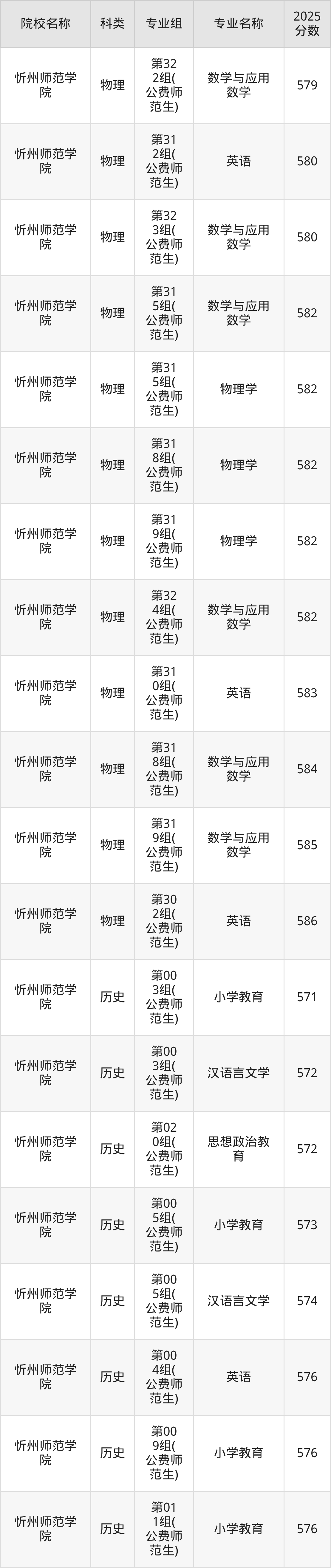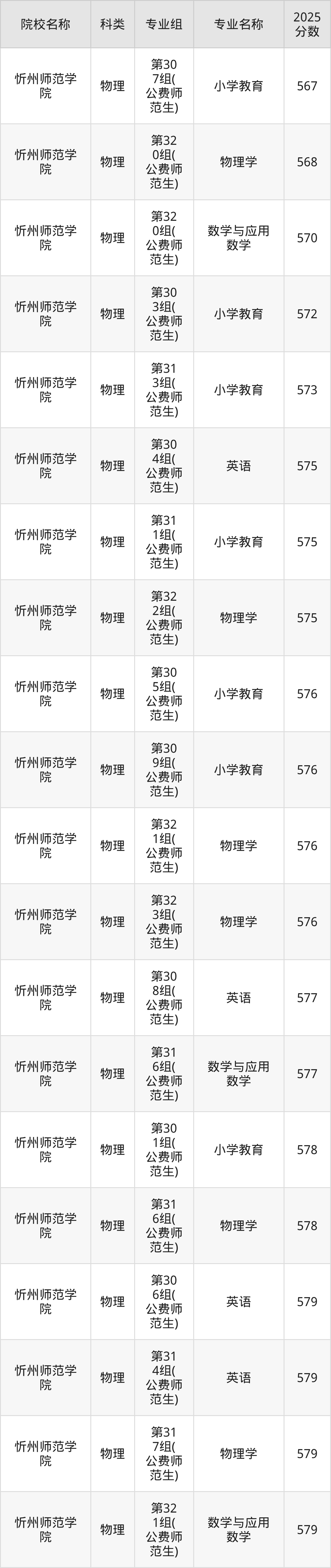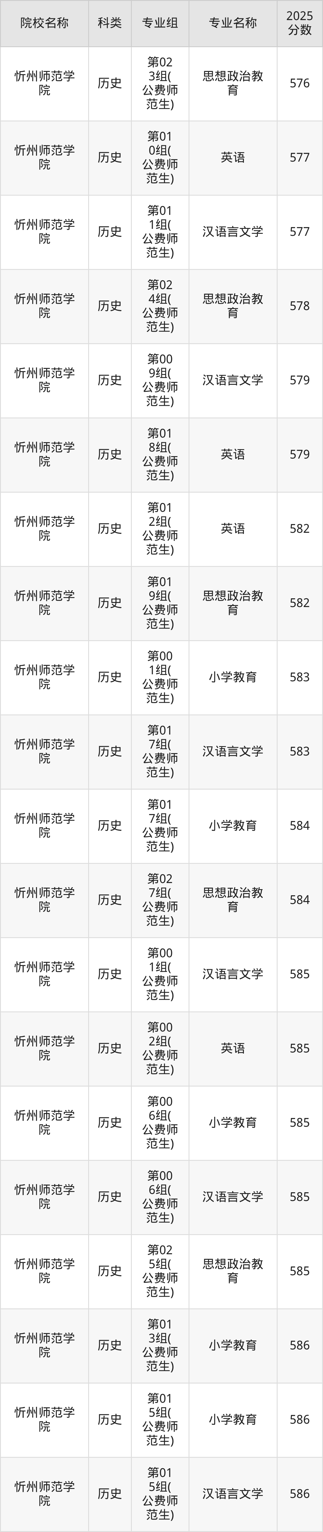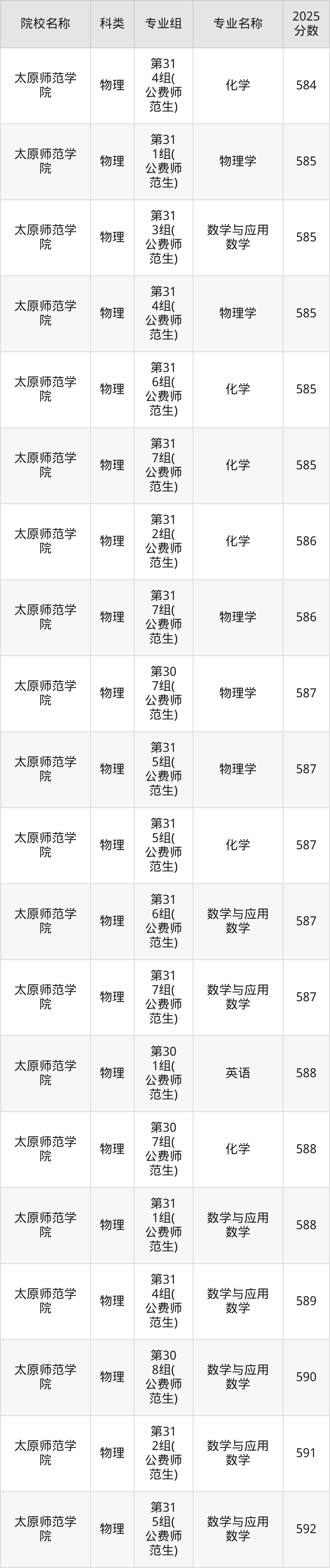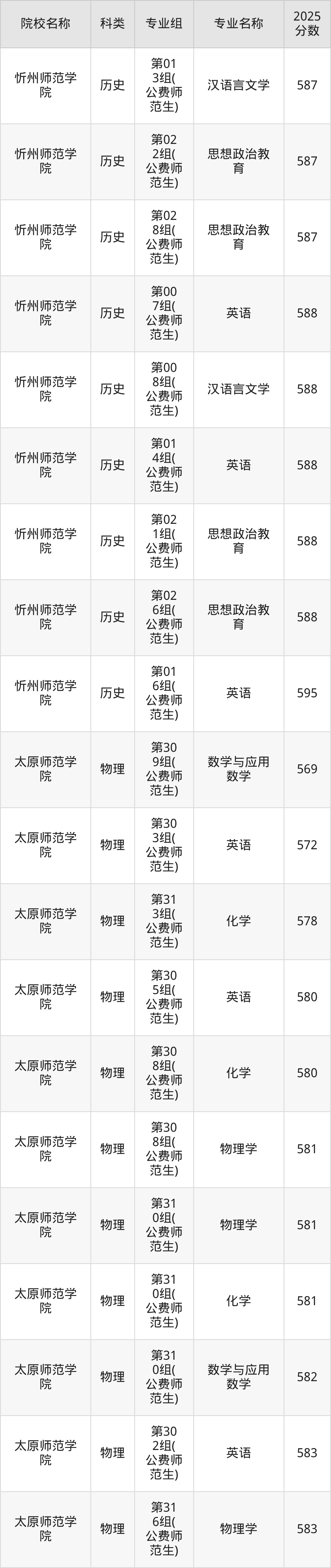 2025年山西地方公费师范生各校录取分数线如下:忻州师范学院最低567分、太原师范学院最低569分、山西师范大学最低574分。
