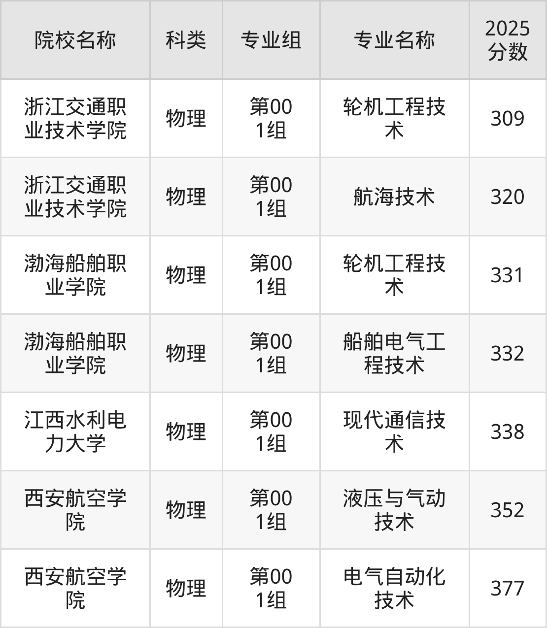 2025年吉林定向士官各校录取分数线如下:浙江交通职业技术学院最低309分、渤海船舶职业学院最低331分、江西水利电力大学最低338分、西安航空学院最低352分。