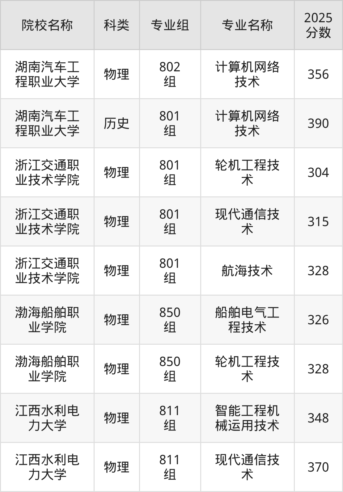 2025年广西定向士官各校录取分数线如下:湖南汽车工程职业大学最低356分、浙江交通职业技术学院最低304分、渤海船舶职业学院最低326分、江西水利电力大学最低348分。