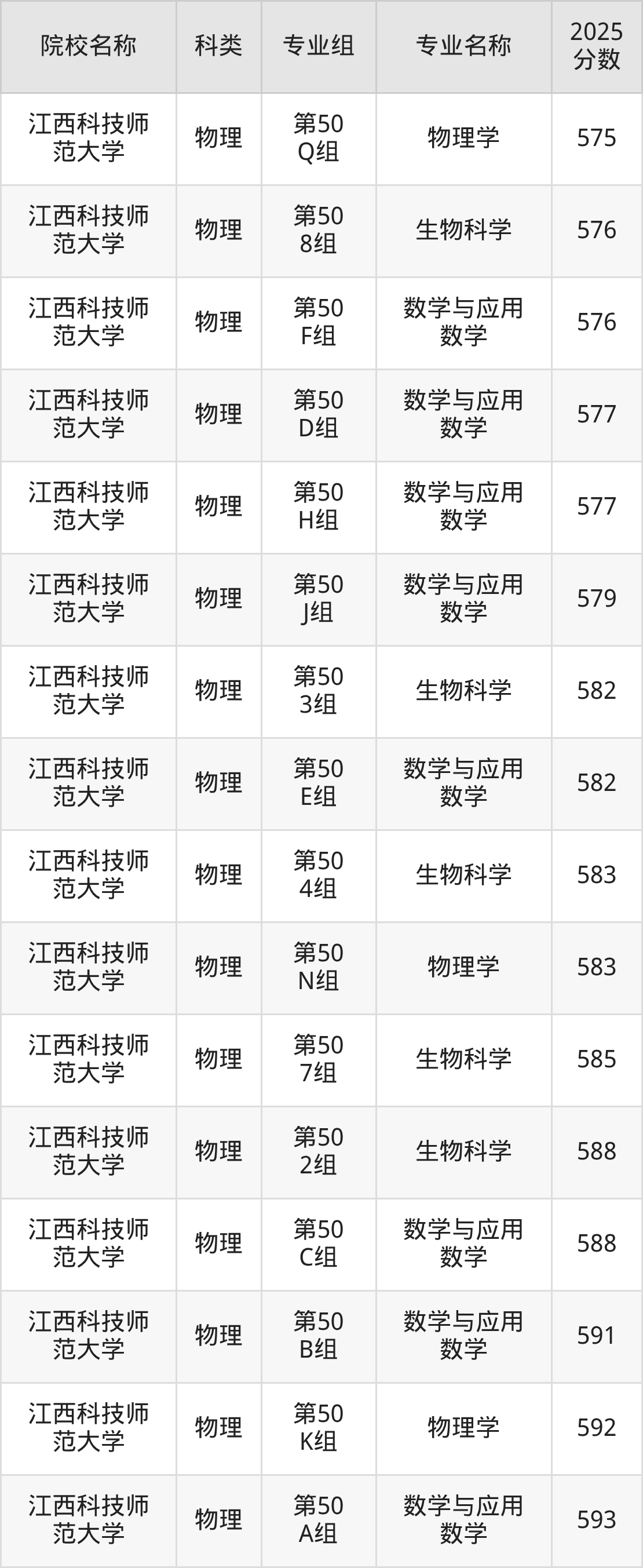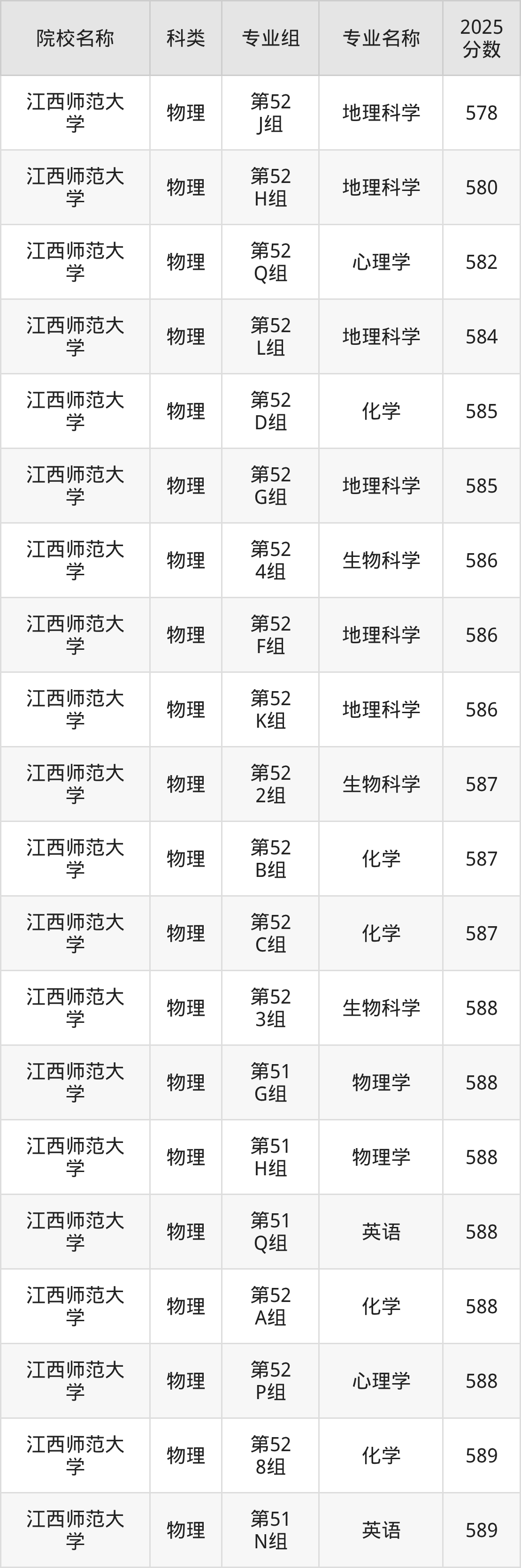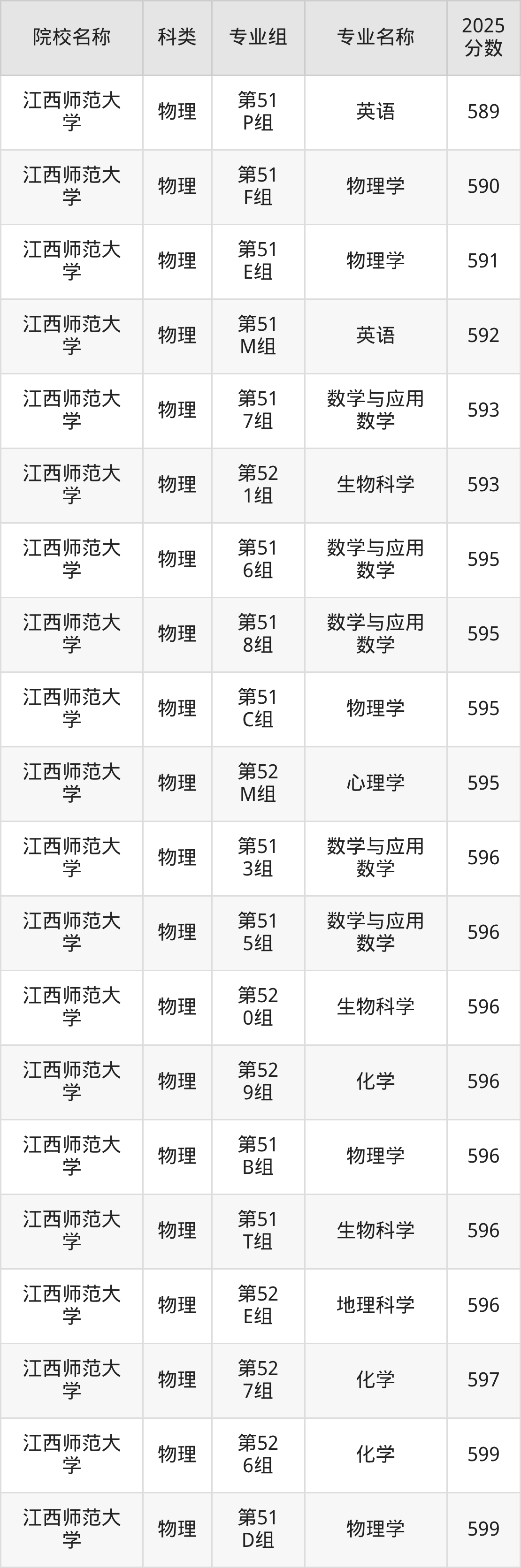 2025年在江西地方公费师范生录取分数线主要位于573分-593分之间,物理类最低分573分,对应最低分专业是第50P组的物理学专业、第50R组的物理学专业。最高分地方公费师范生专业是数学与应用数学,2025年录取分数线为593分。