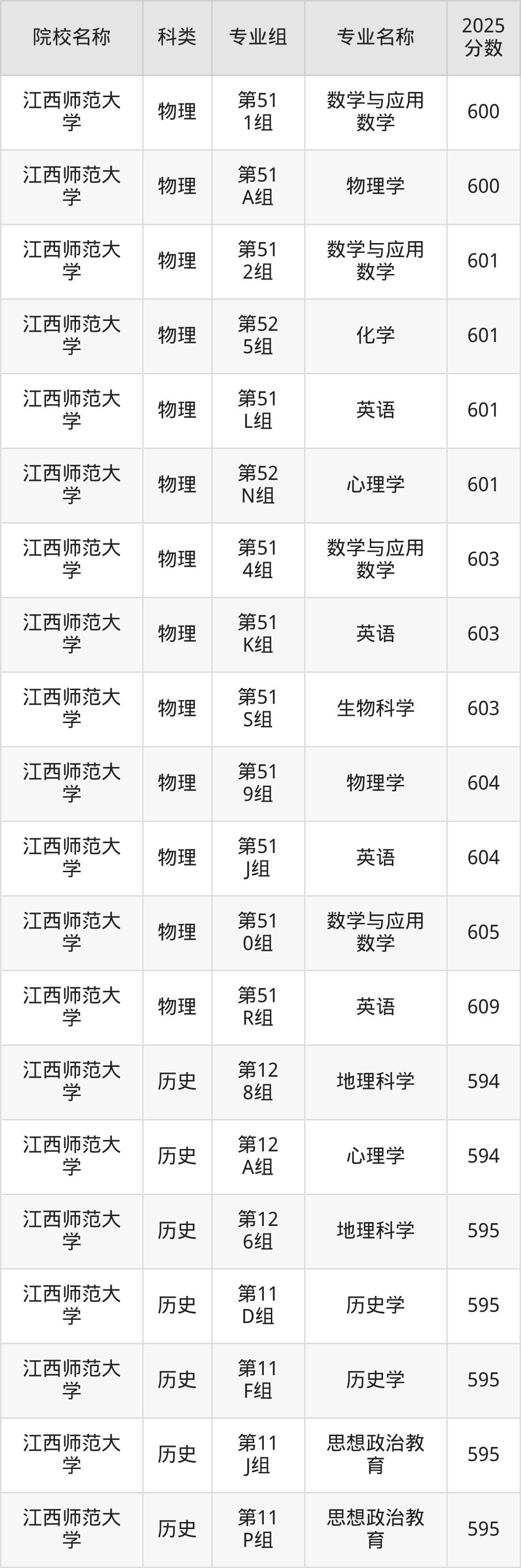 2025年在江西地方公费师范生录取分数线主要位于578分-614分之间,物理类最低分578分,对应最低分专业是第52J组的地理科学专业;历史类最低分594分,对应最低分专业是第128组的地理科学专业、第12A组的心理学专业。