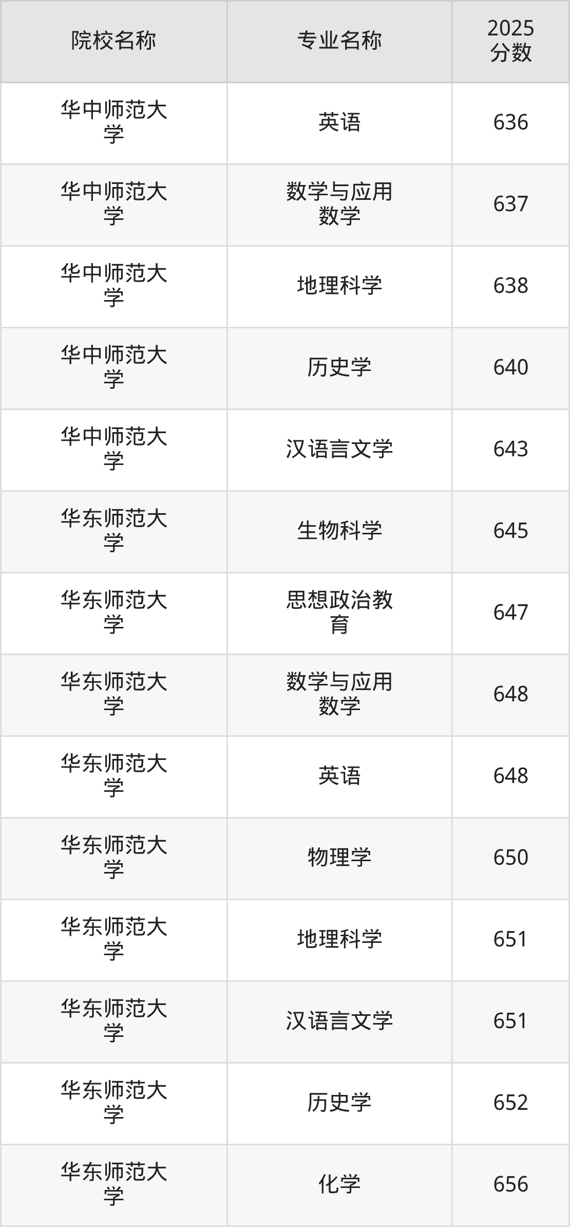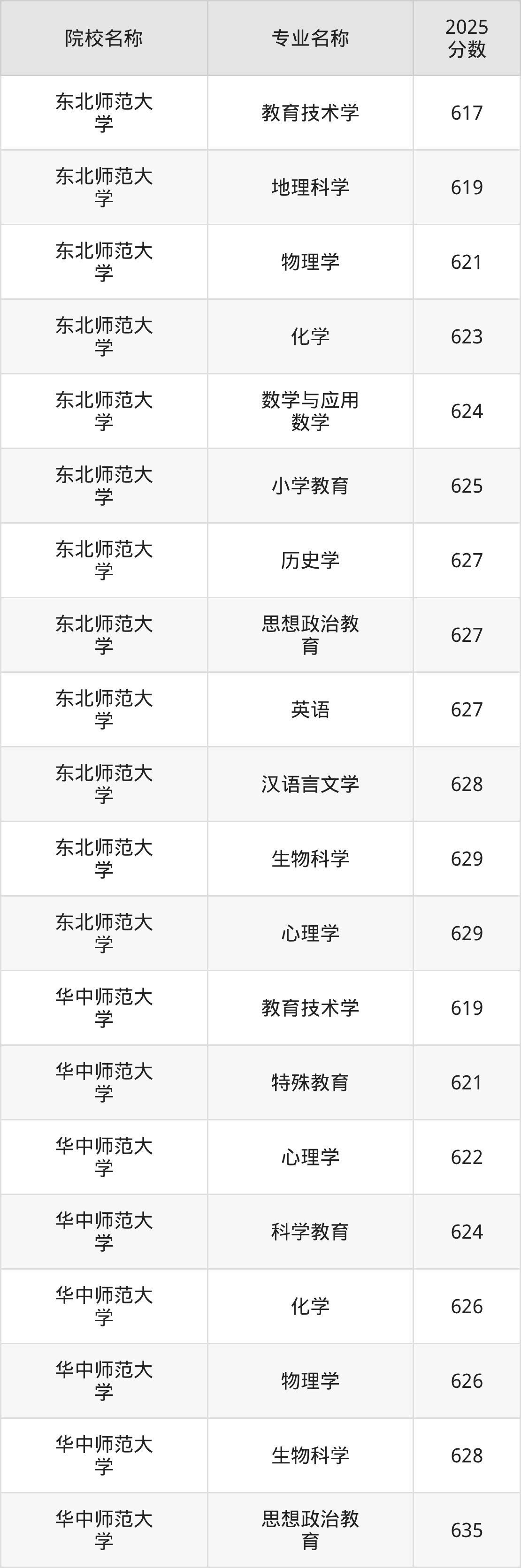 2025年山东国家公费师范生各校录取分数线如下:东北师范大学最低617分、华中师范大学最低619分、华东师范大学最低645分。