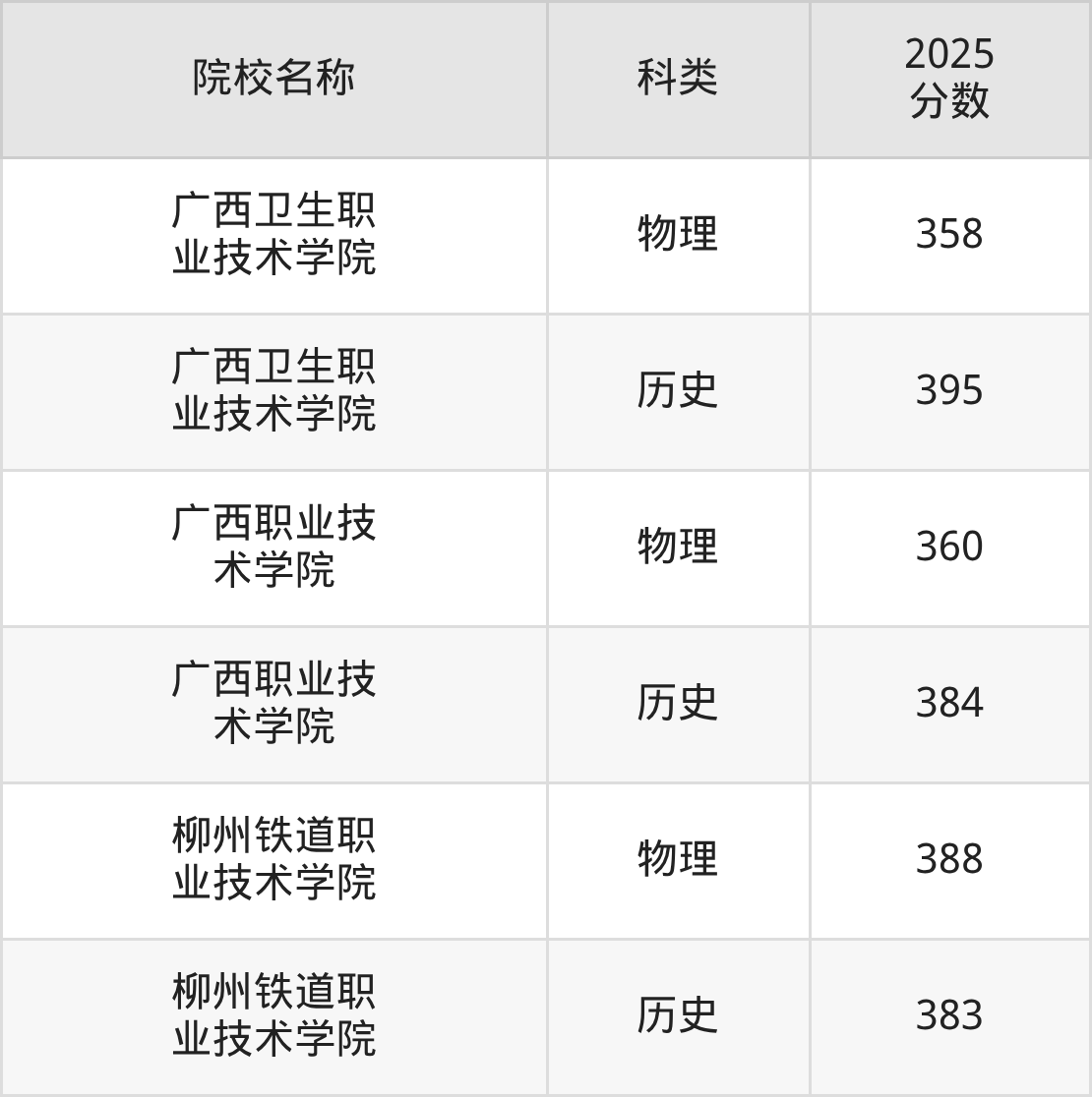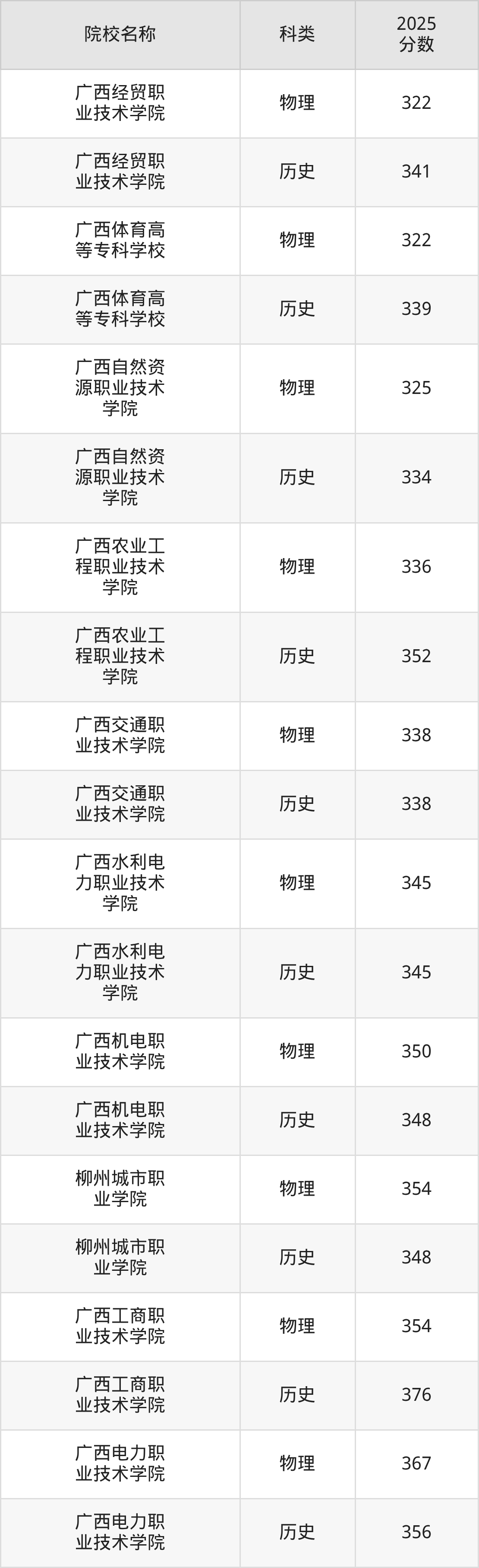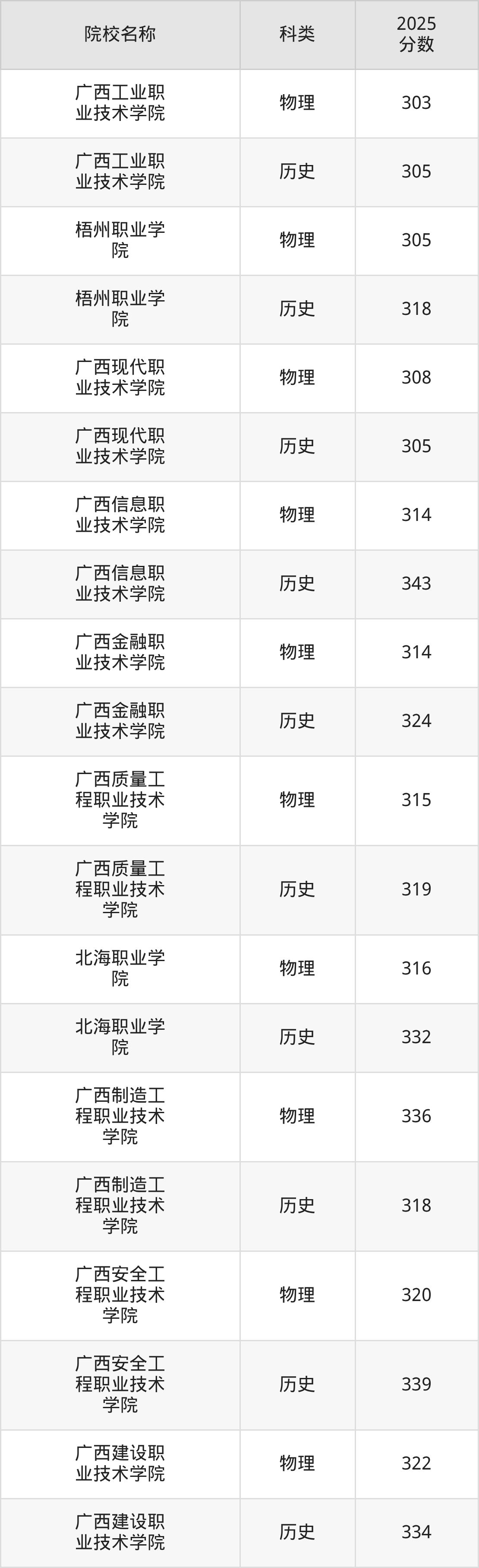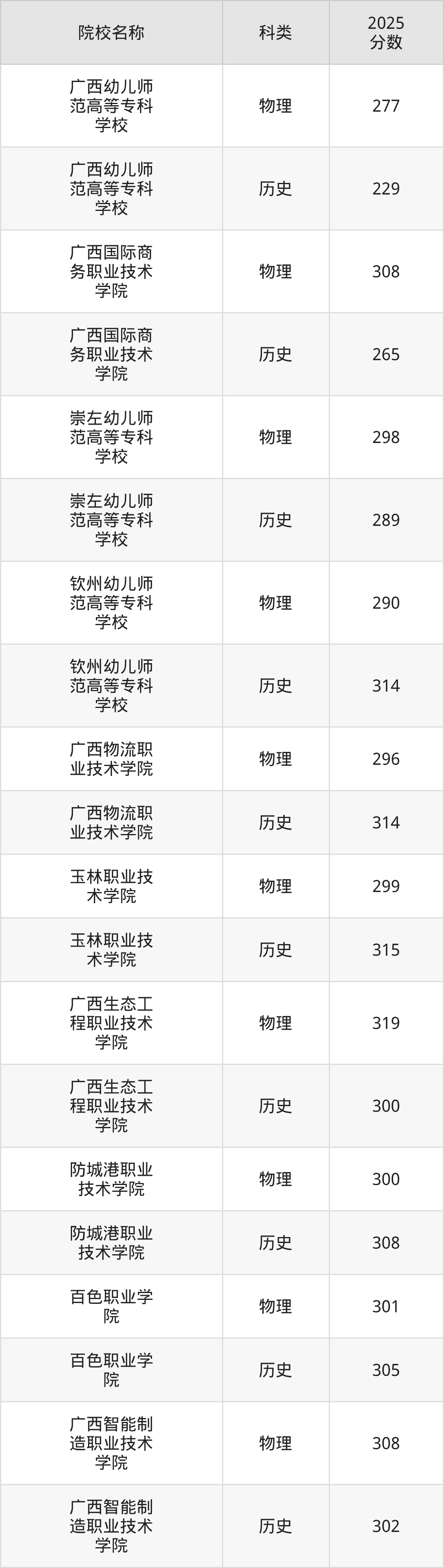 更多院校分数可在2025年广西公办大专录取分数线一览表中查询(数据较多,这里仅列举各校各科类最低分):