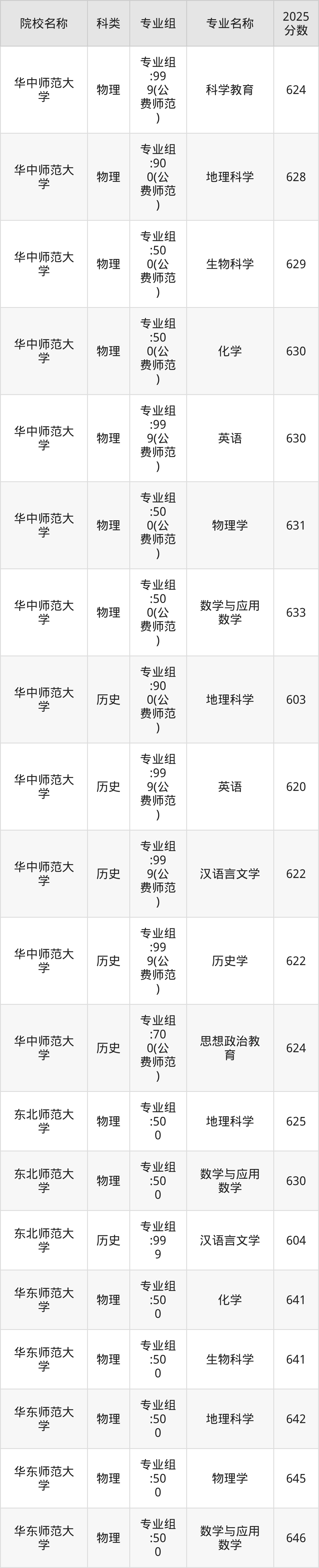 2025年福建国家公费师范生各校录取分数线如下:华中师范大学最低603分、东北师范大学最低604分、华东师范大学最低621分。