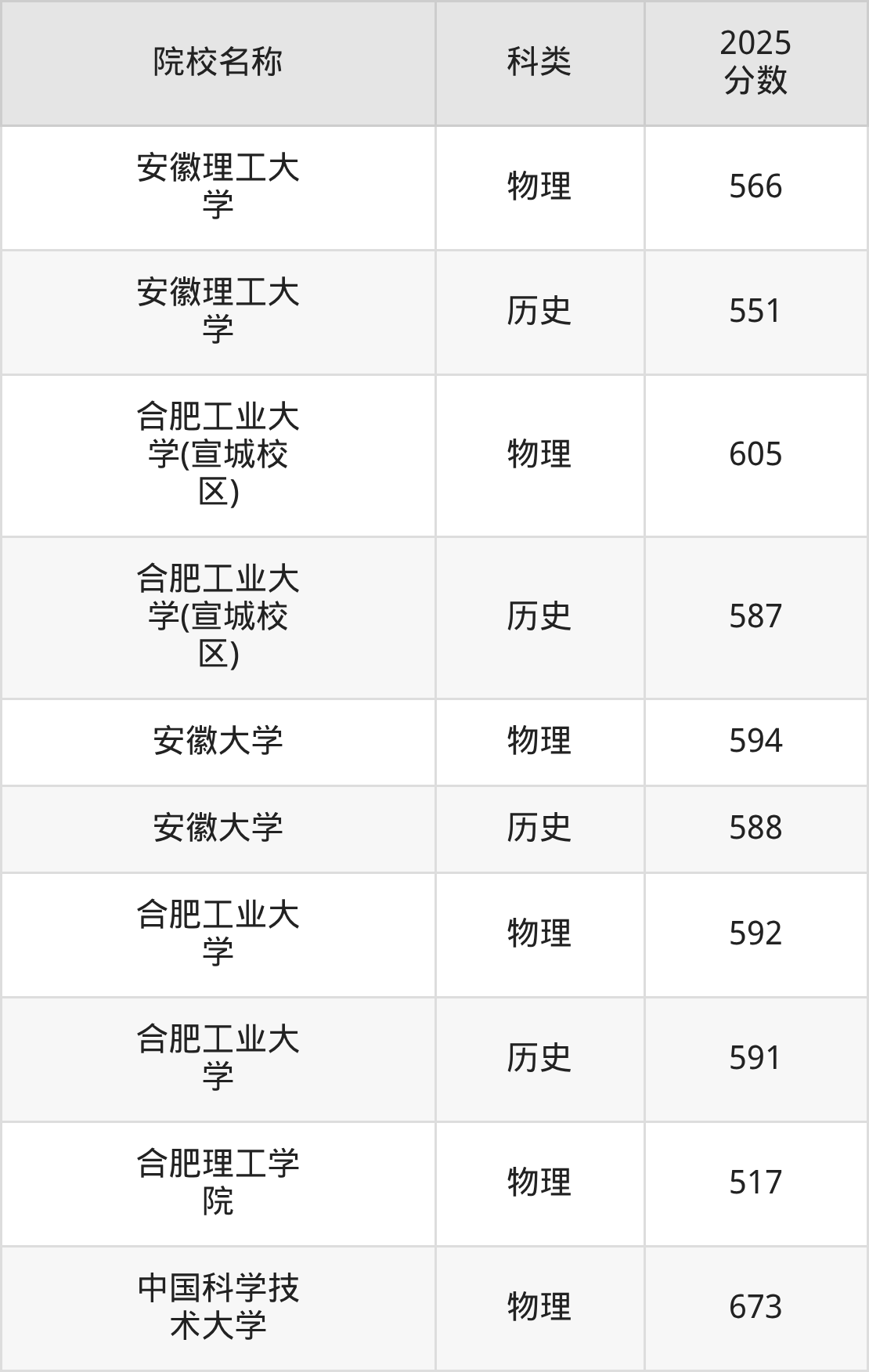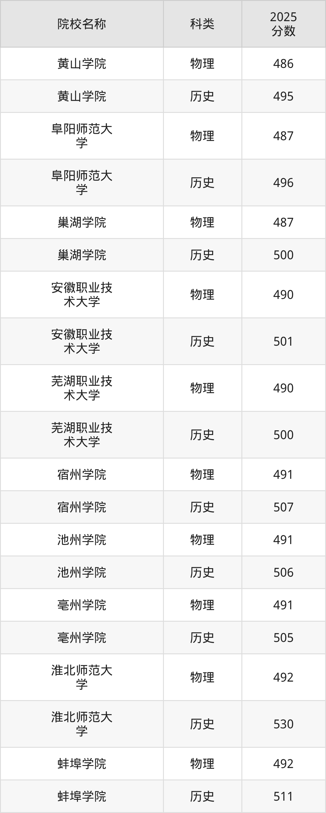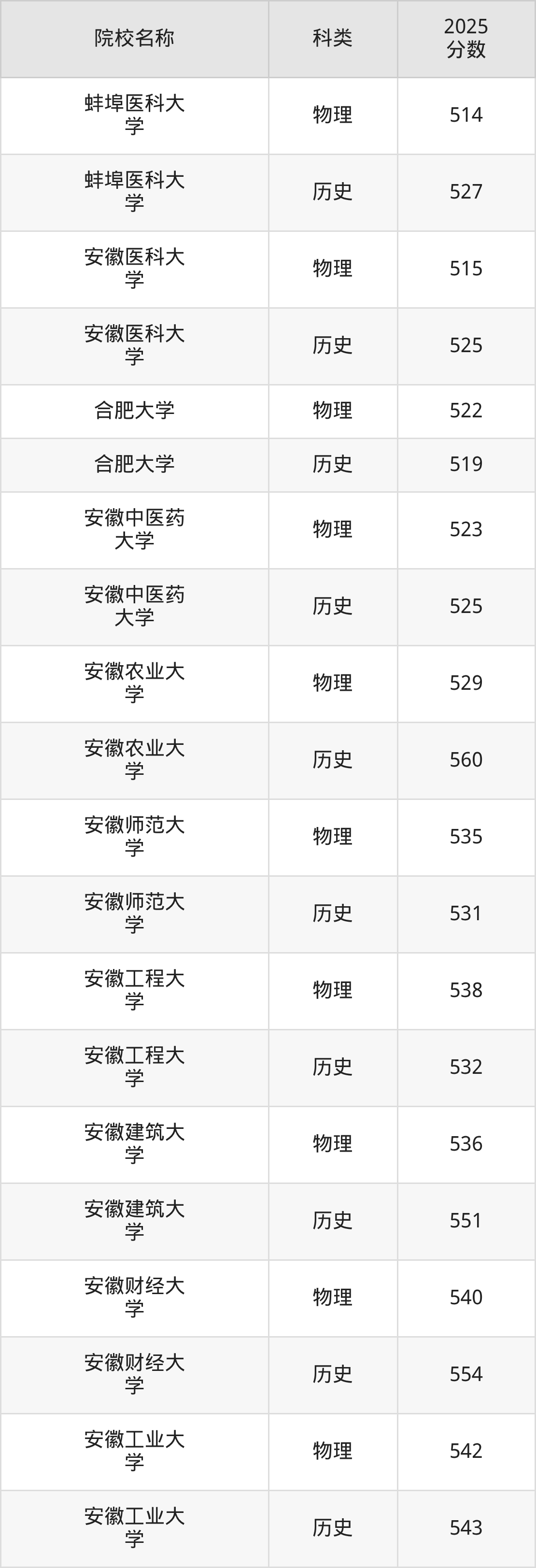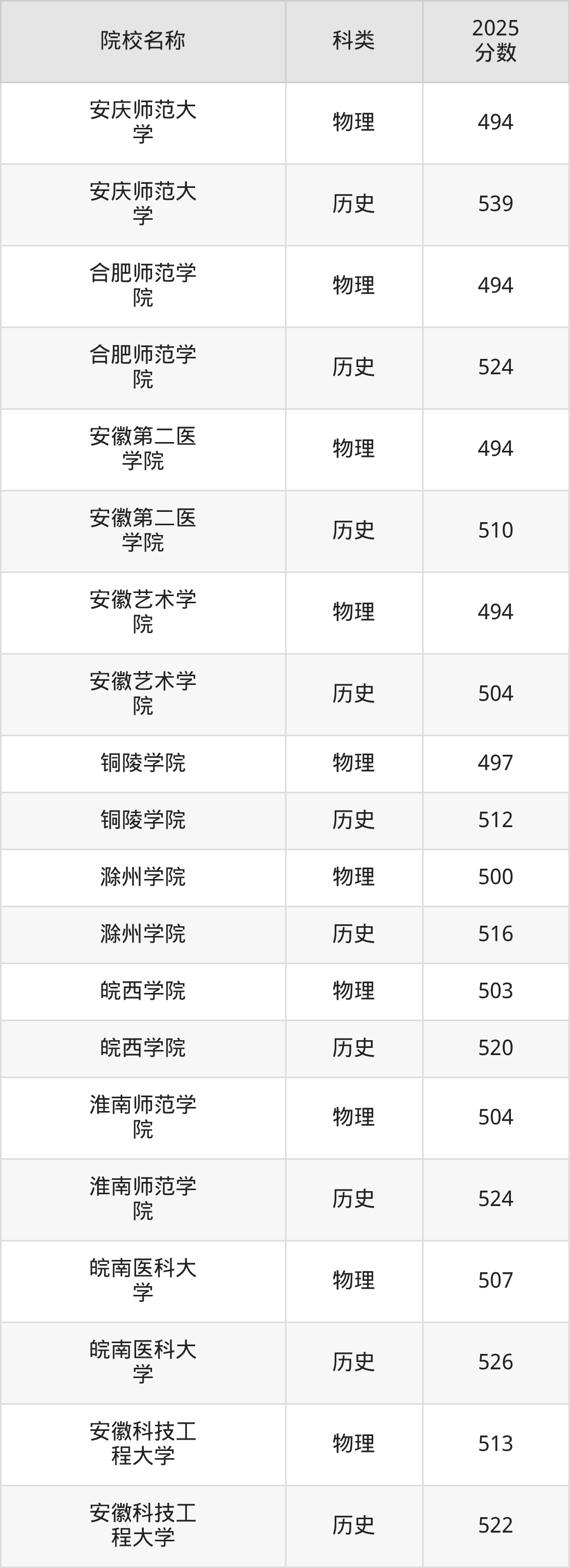 更多院校分数可在2025年安徽公办本科录取分数线一览表中查询(数据较多,这里仅列举各校各科类最低分):