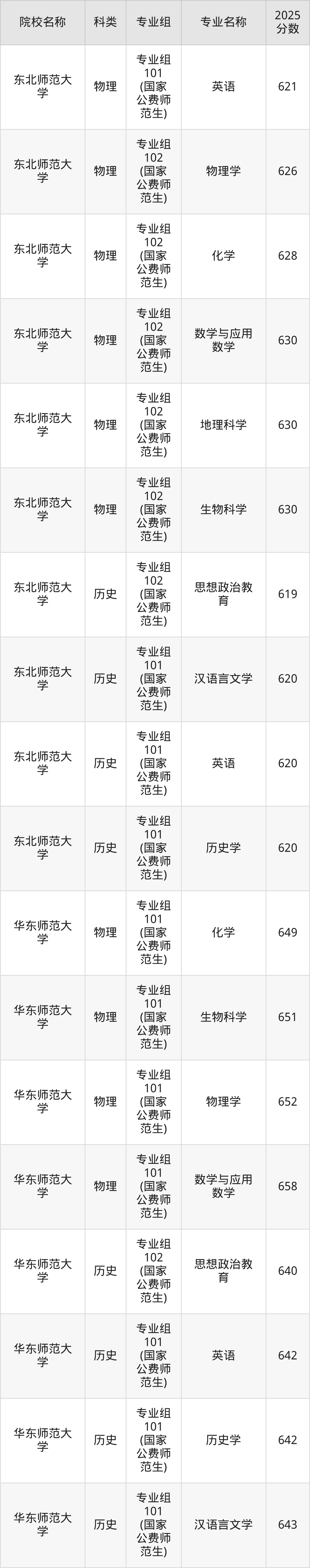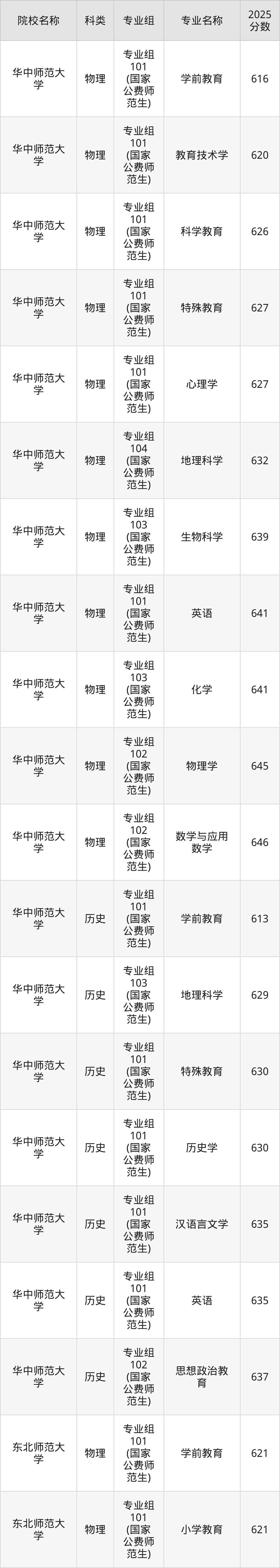 2025年四川国家公费师范生各校录取分数线如下:华中师范大学最低613分、东北师范大学最低619分、华东师范大学最低640分。