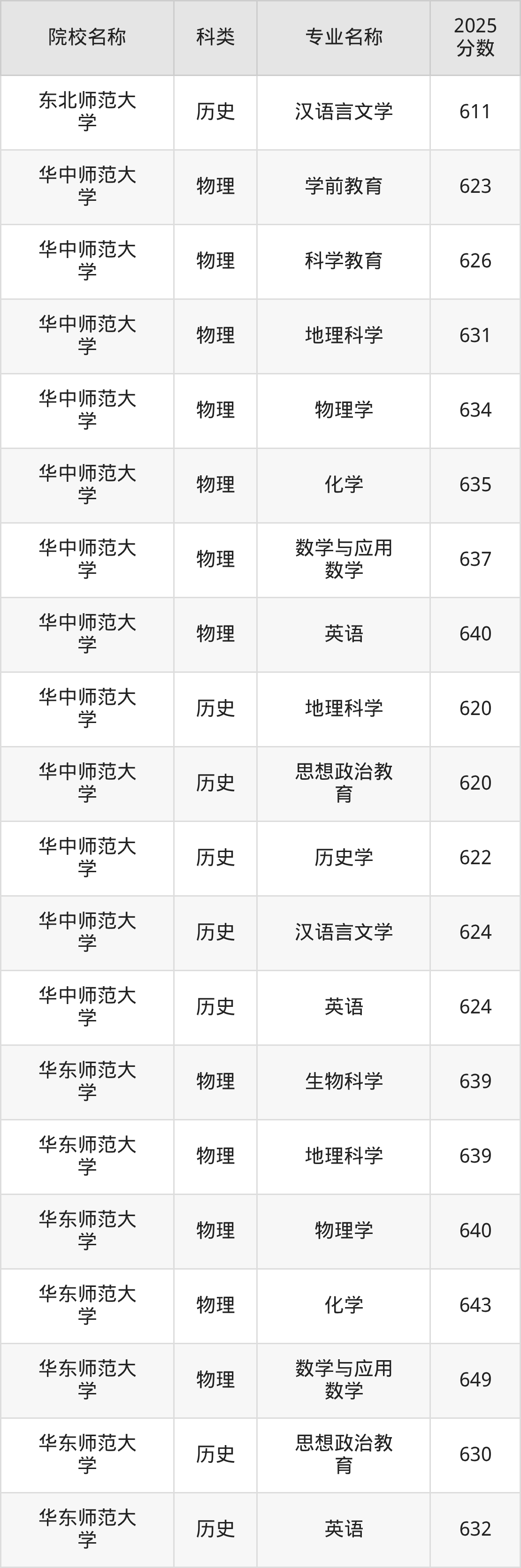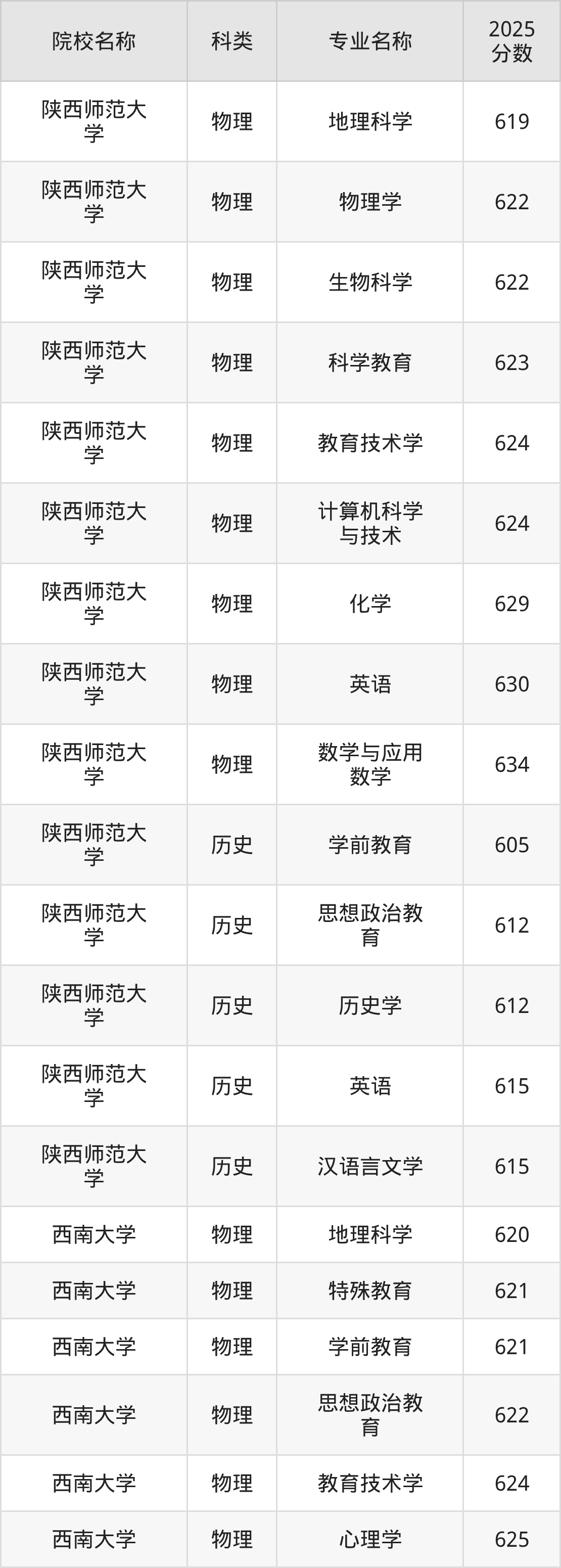 2025年在重庆国家公费师范生录取分数线主要位于630分-649分之间,物理类最低分639分,对应最低分专业是生物科学专业、地理科学专业;历史类最低分630分,对应最低分专业是思想政治教育专业。