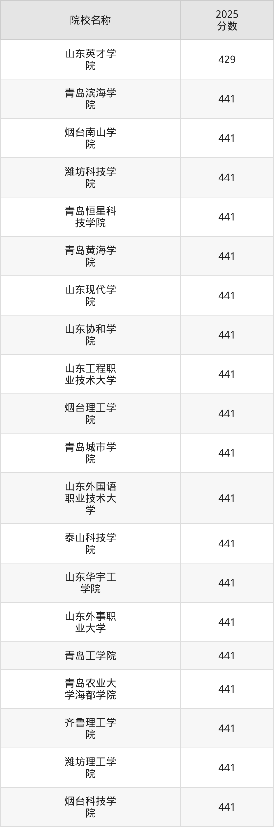 1、山东英才学院:最低429分