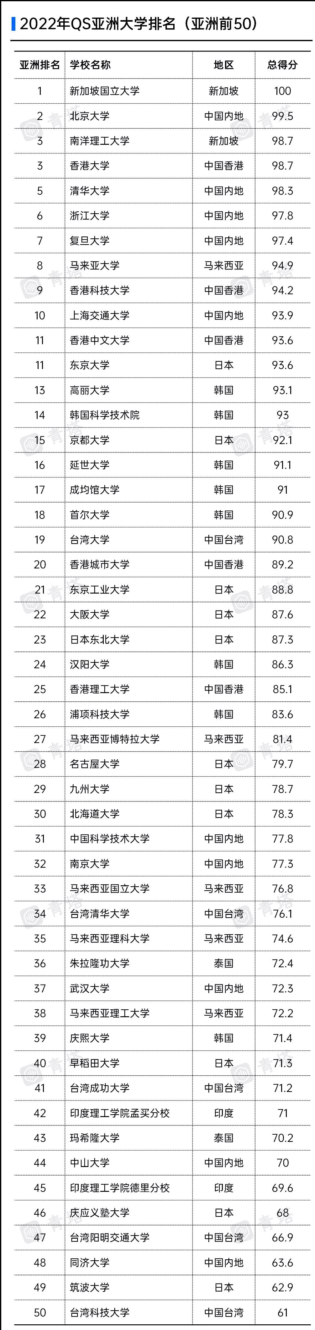 二、qs亚洲排名2022完整名单