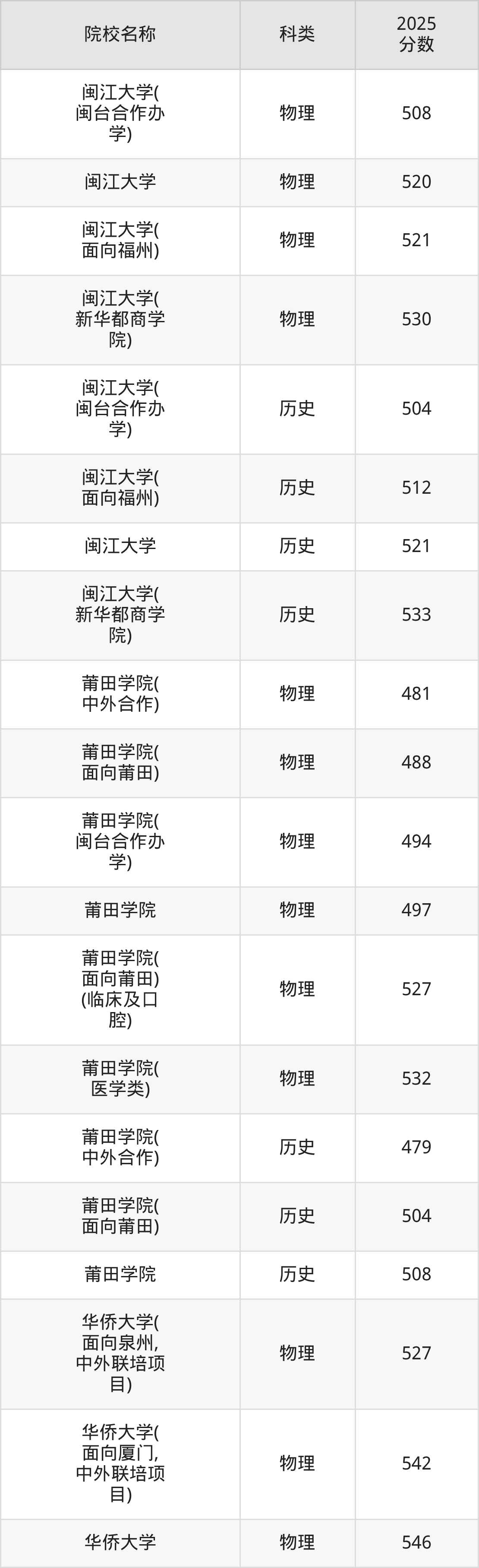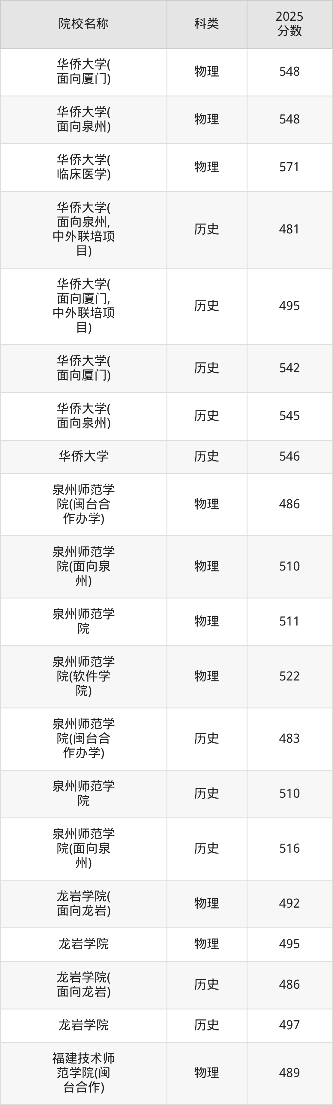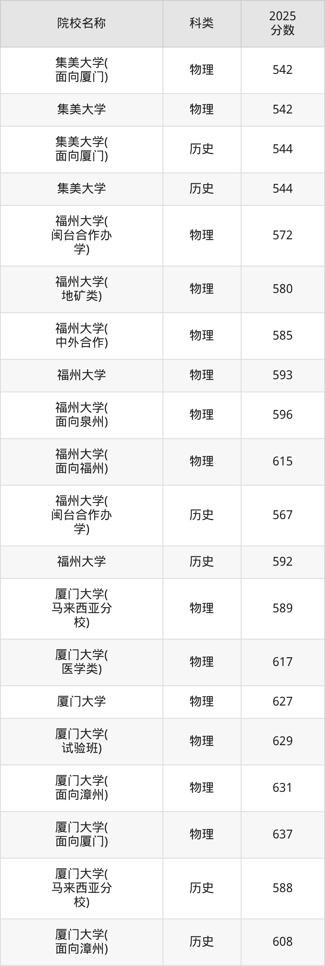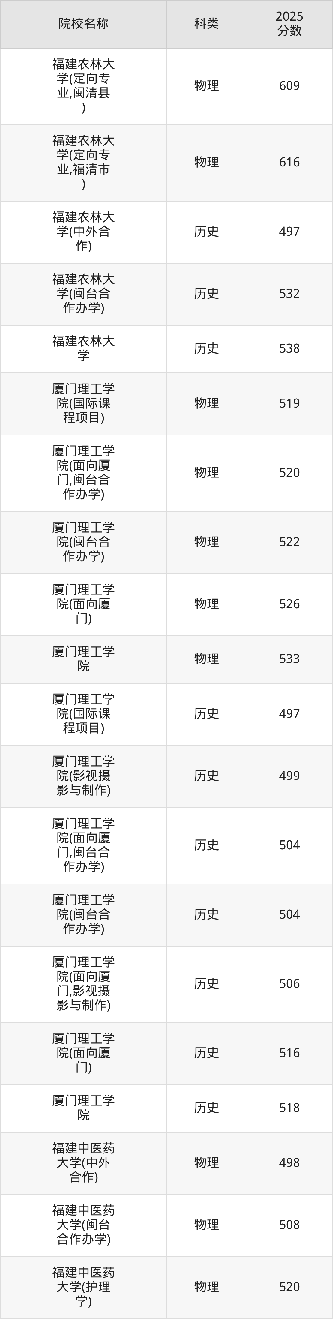 更多院校分数可在2025年福建公办本科录取分数线一览表中查询(数据较多,这里仅列举各校各科类最低分):