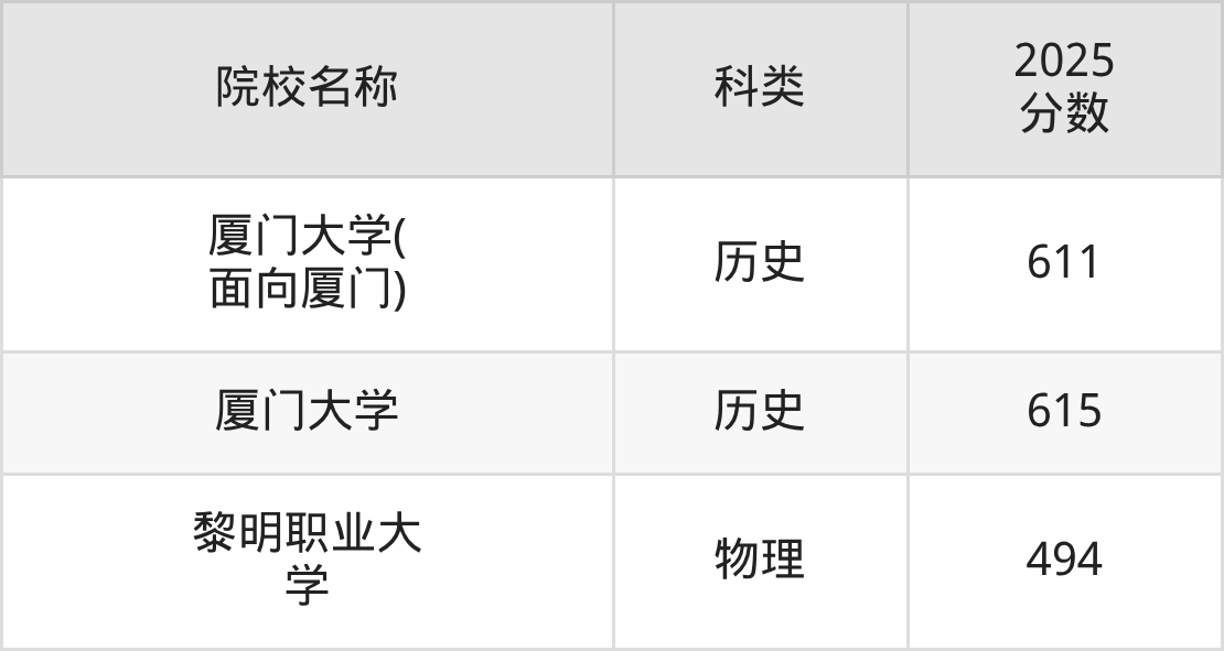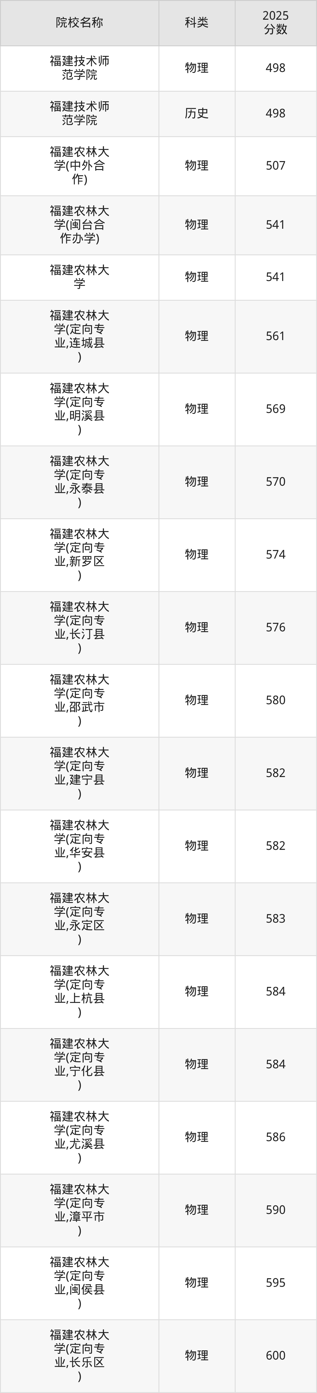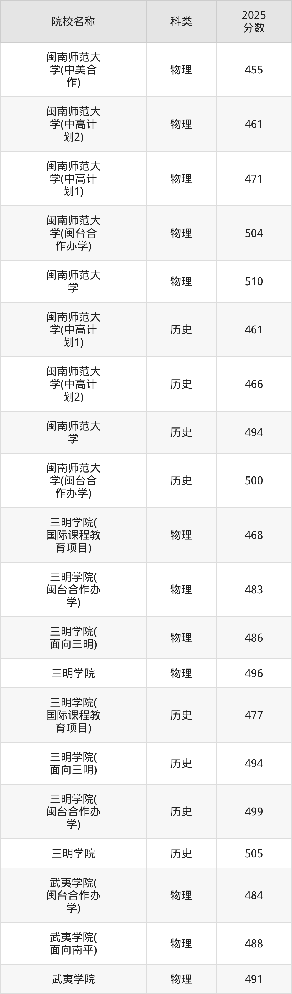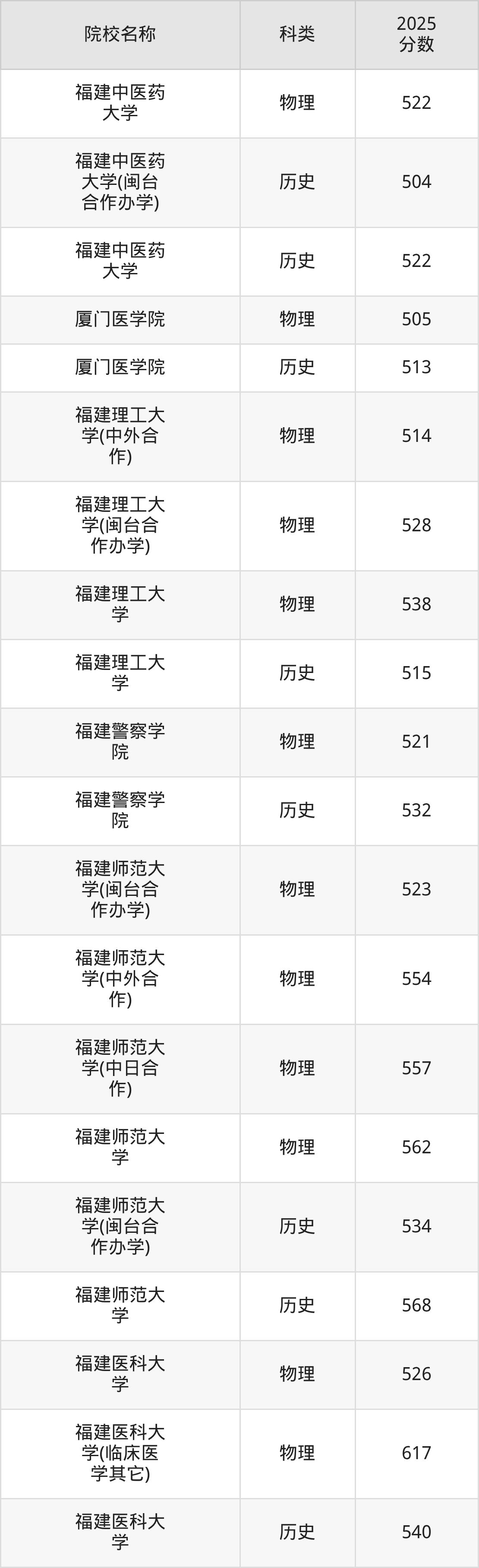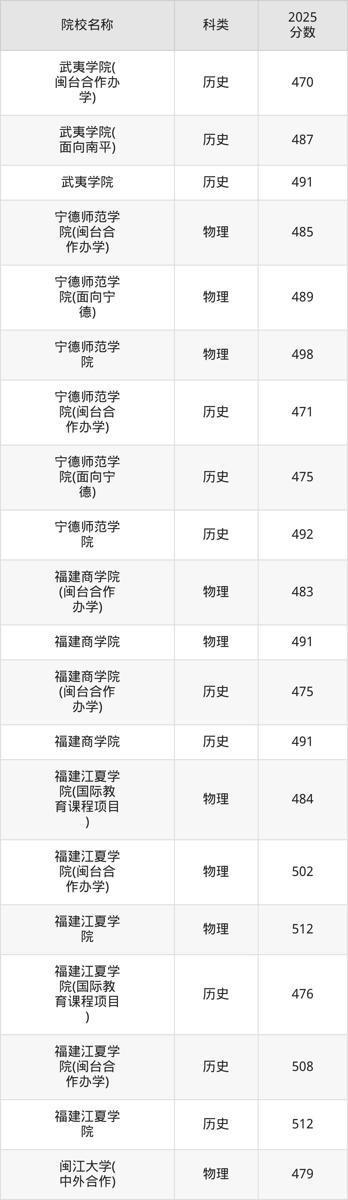 更多院校分数可在2025年福建公办本科录取分数线一览表中查询(数据较多,这里仅列举各校各科类最低分):