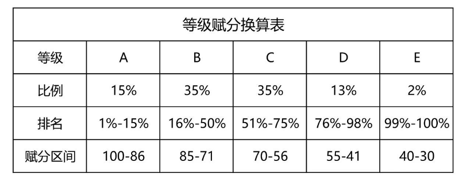 每个等级对应的排名区间和赋分区间有所不同,A等级排名为前1%-15%,赋分区间是100-86分;B等级排名为16%-50%,赋分区间是85-71分;C等级排名为51%-75%,赋分区间是70-56分;D等级排名为76%-98%,赋分区间是55-41分;E等级排名为99%-100%,赋分区间是40-30分。