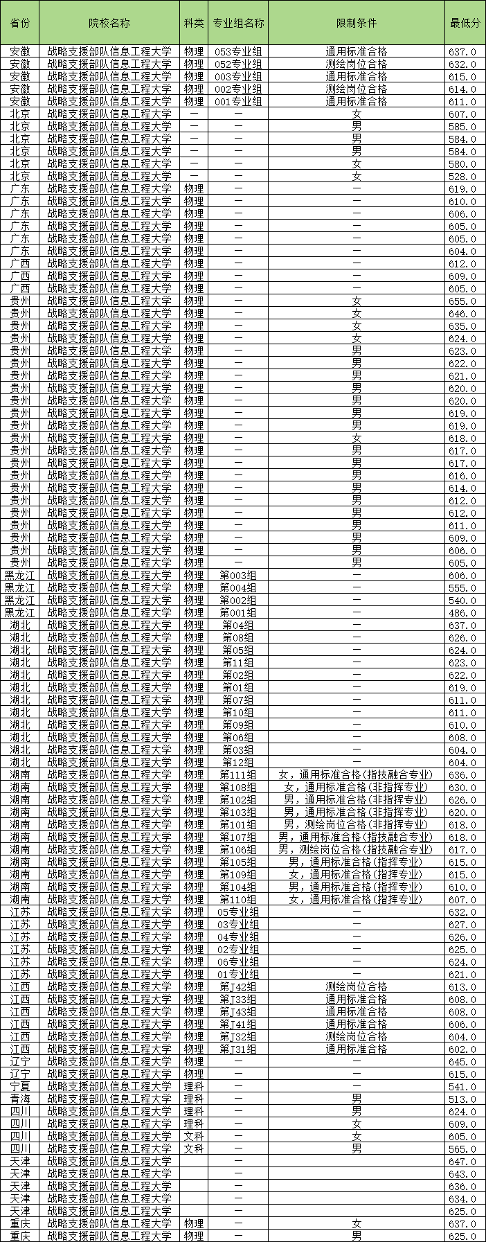 | 网络空间部队信息工程大学 | 物理 | 002专业组 | 测绘岗位合格 | 626 |
