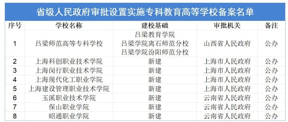 根据教育部最近发布的通知,即《专科教育高等学校备案名单的函》,对于各省申请筹办的大学进行正式的批复,经过教育部专家组的充分审核,目前共有八所筹备的大学获得批准建立,山西审批新设1所、上海审批新设4所、云南审批新设3所专科层次高等学校,具体的名单如下。