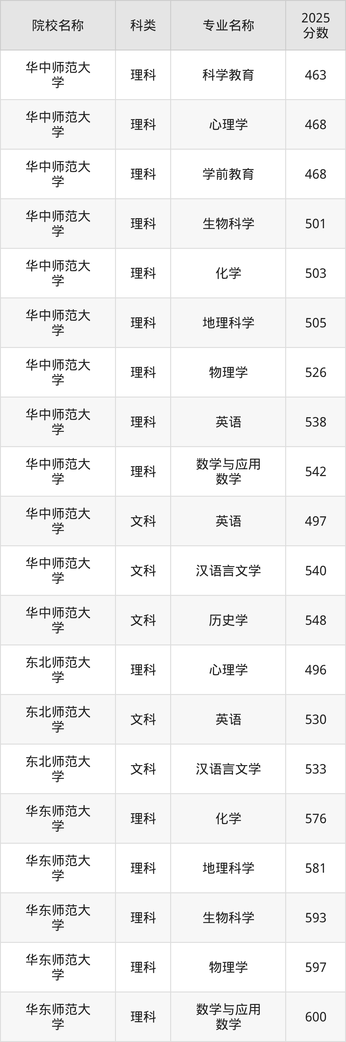 2025年新疆国家公费师范生各校录取分数线如下:华中师范大学最低463分、东北师范大学最低496分、华东师范大学最低565分。
